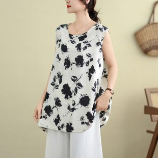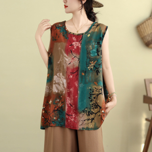 背心上衣夏季 棉绸印花无袖 新款 宽松遮肚A摆衫 胖MM大码 打底衫 女装