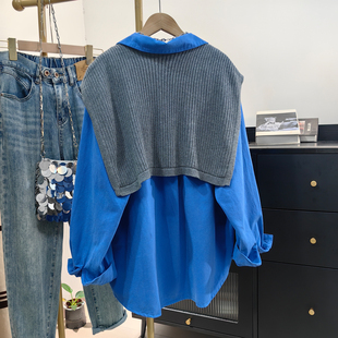 克莱因蓝全棉磨毛衬衫 小个子衬衣外套潮 针织披肩两件套女秋冬新款