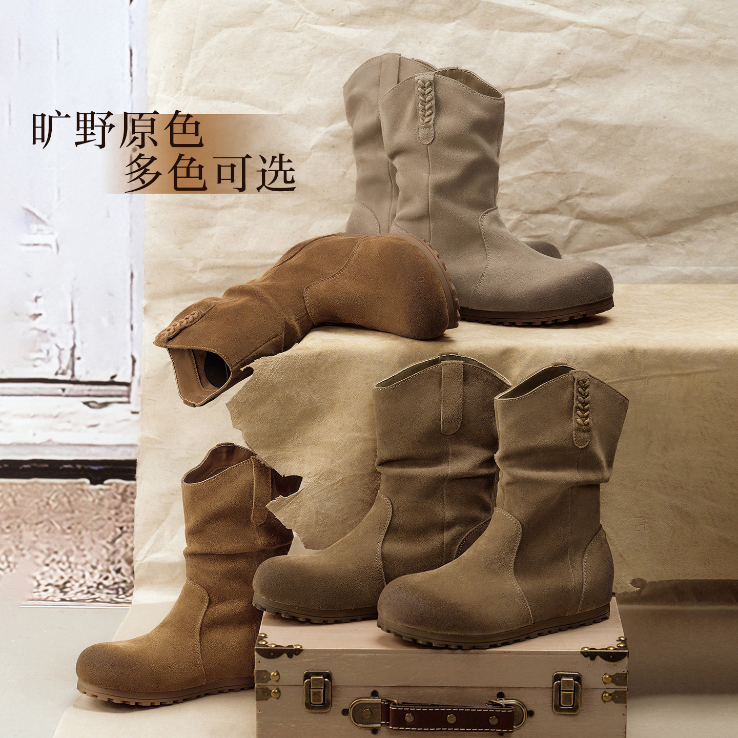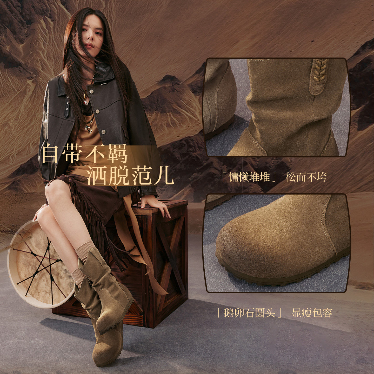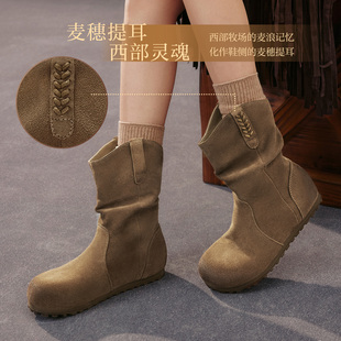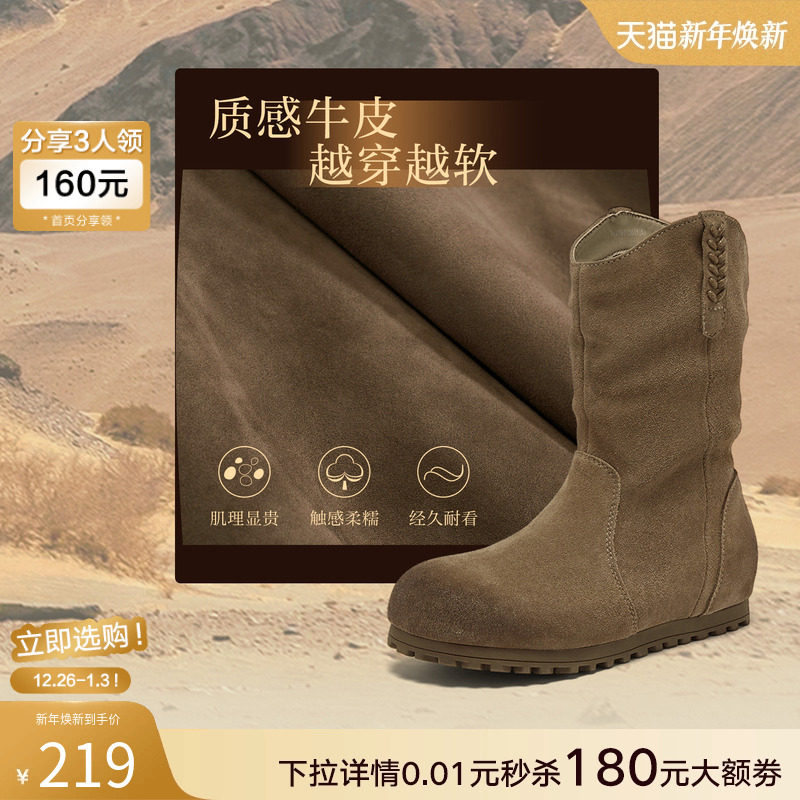 棕色加绒西部靴堆堆靴女美拉德短靴 百思图25冬新款 旷野牧歌
