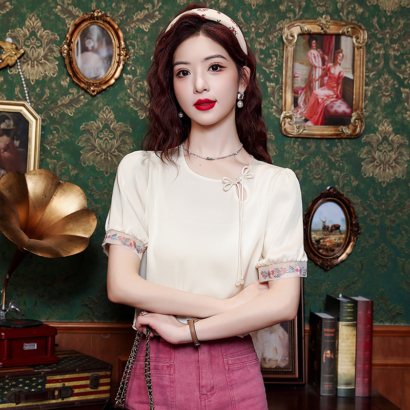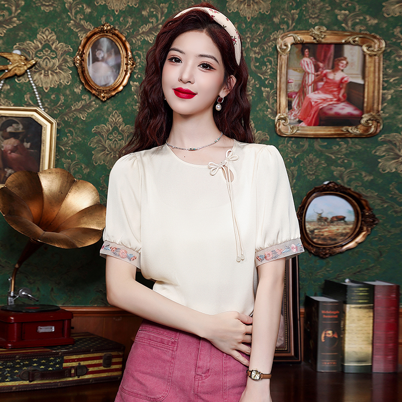 国风雪纺衬衫 2024夏季 新中式 气质显瘦圆领镂空盘扣刺绣短袖 女 新款