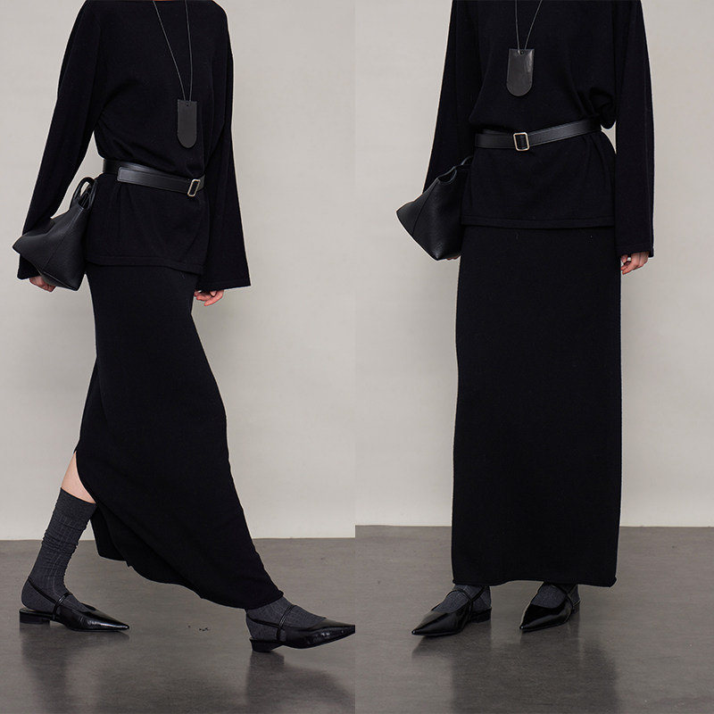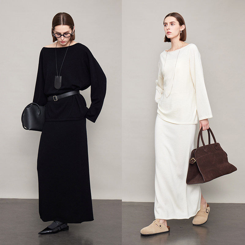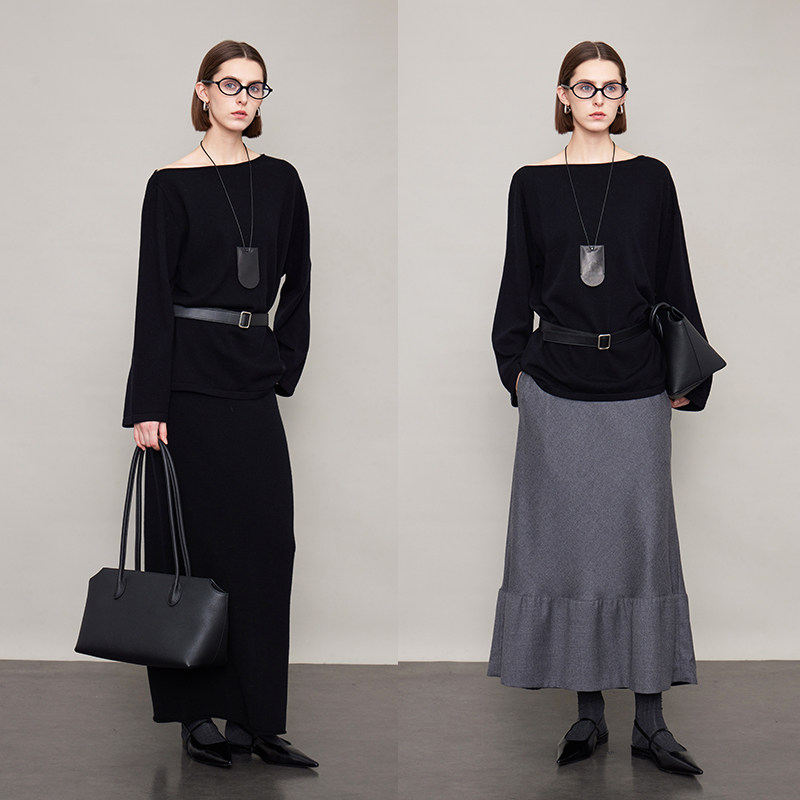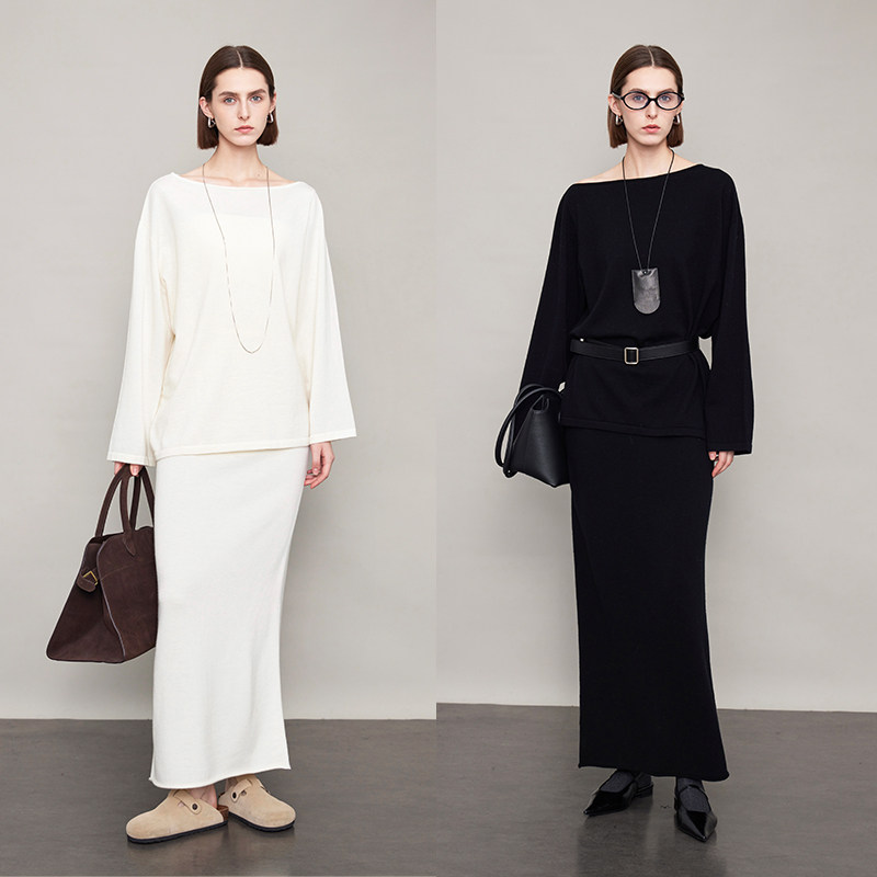 3ONE极简ROW风慵懒套装 半身裙 100羊毛超细澳毛一字肩不对称毛衣