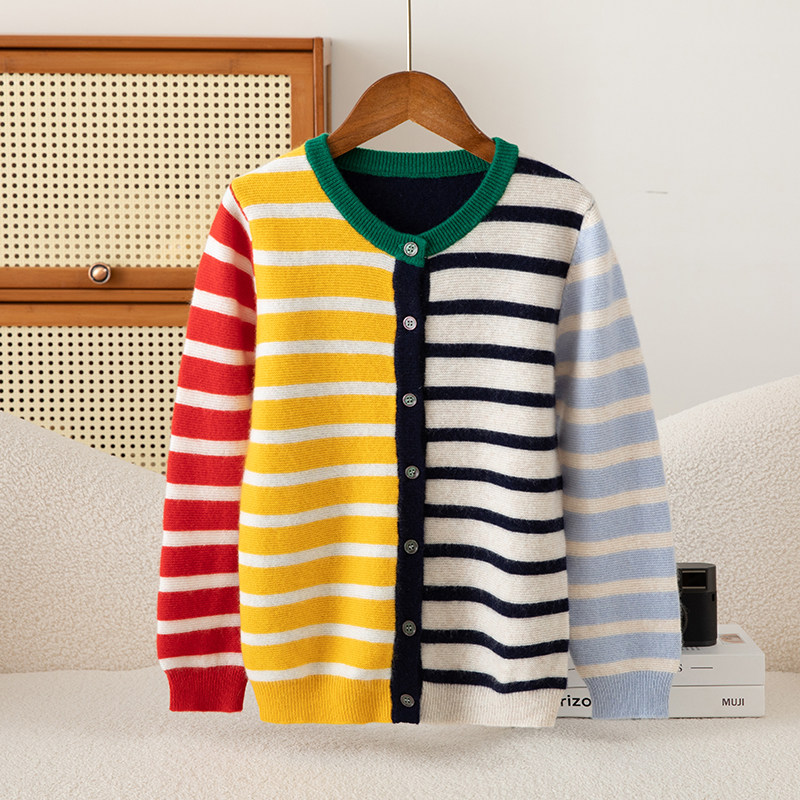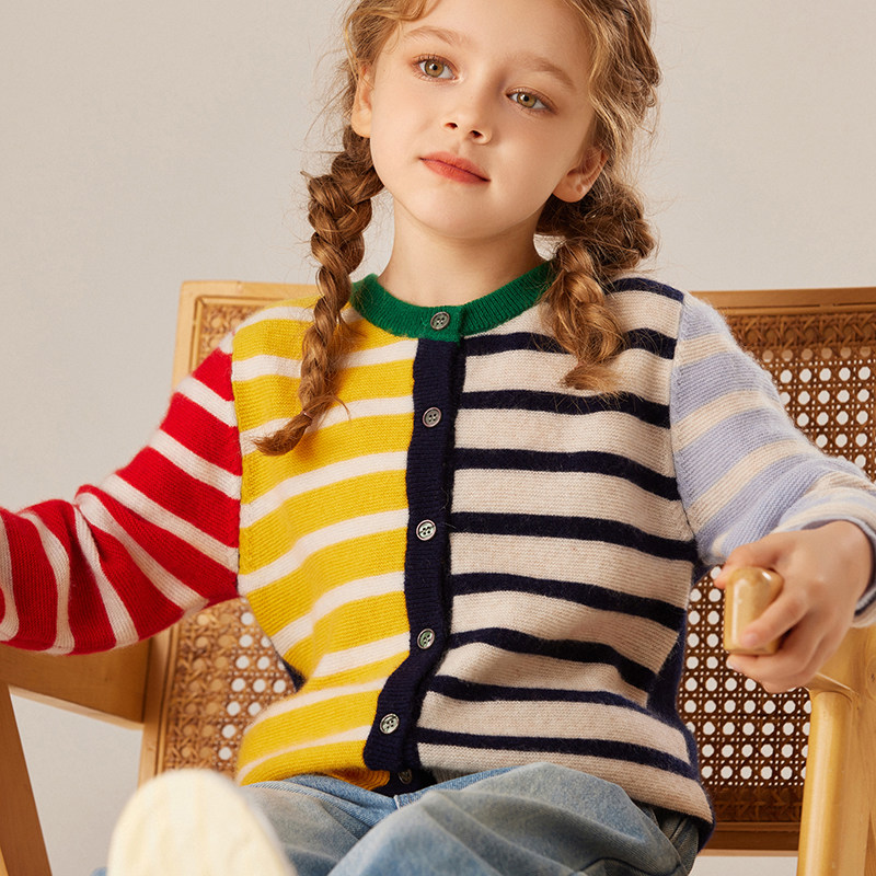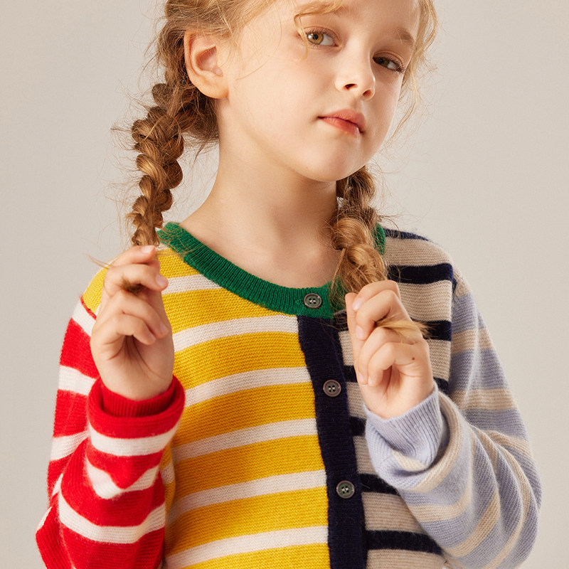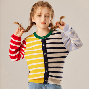儿童彩条100纯山羊绒开衫 中大童毛衣外套 女童秋冬拼色条纹针织衫