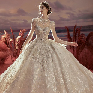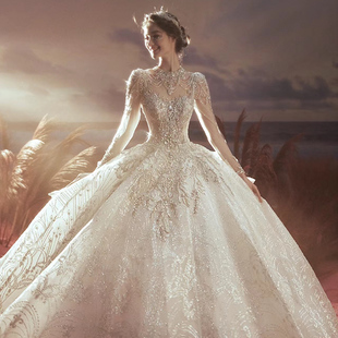 新娘结婚婚纱重工长袖 2025新款 宫廷公主风大拖尾主纱 银光月神