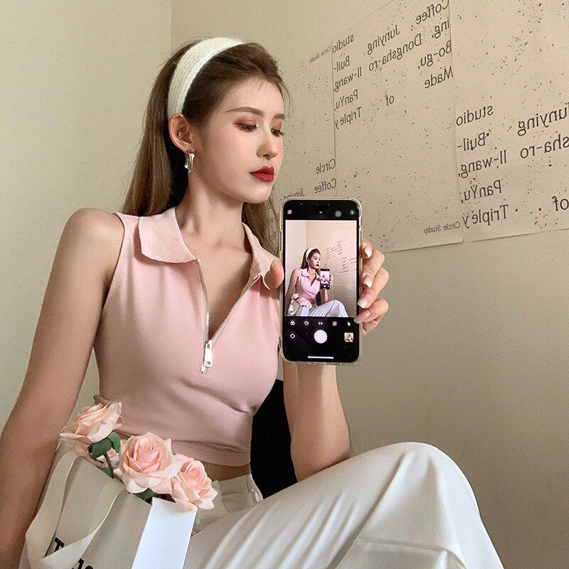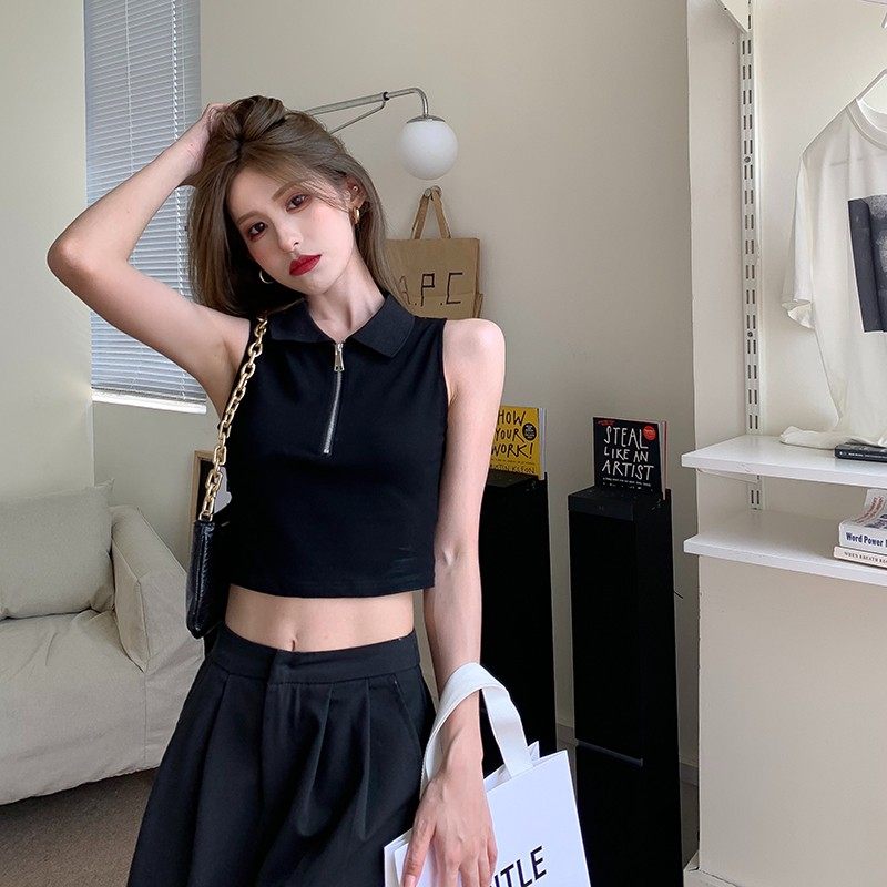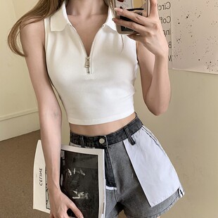 显瘦短款 polo领拉链t恤无袖 上衣 韩版 甜辣妹针织背心女夏2023新款