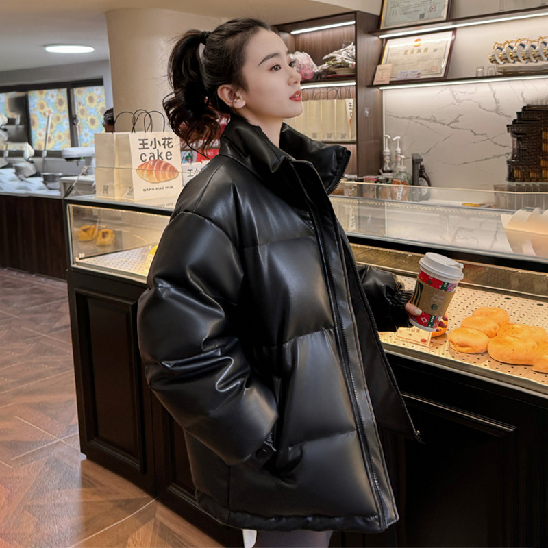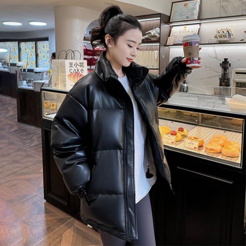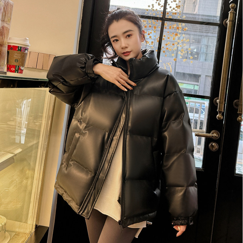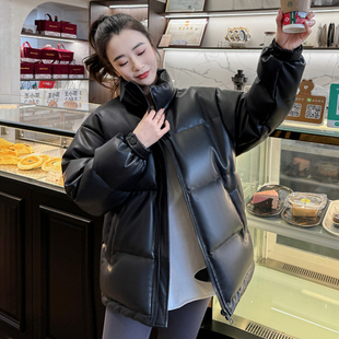 宽松加厚白鸭绒面包服 韩版 PU皮羽绒服女短款 免洗高端2023年新款