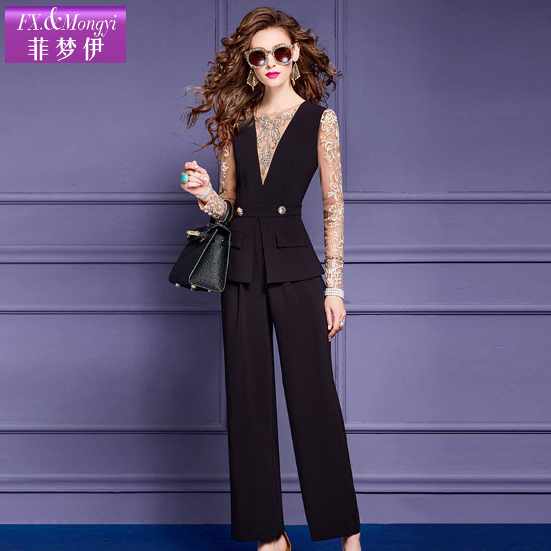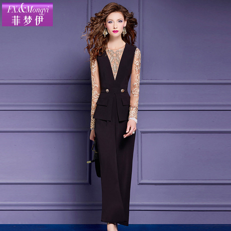 裤 高级垂感宽松休闲西装 子 女春季 菲梦伊假两件钉珠绣花黑色连体裤