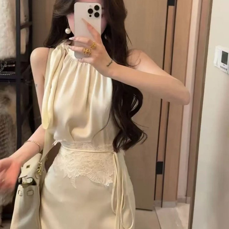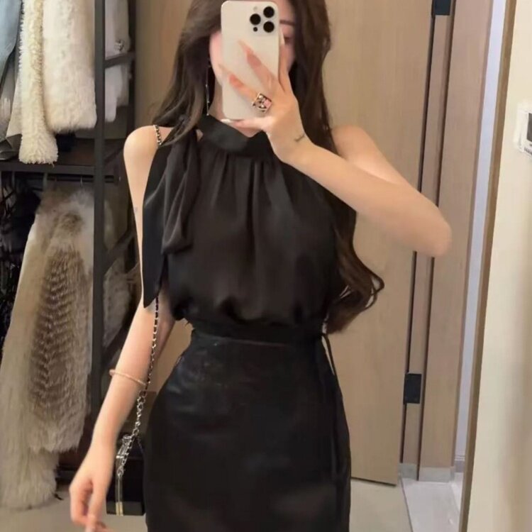 高级感无袖 夏季 挂脖上衣高腰a字半身短裙 女2025新款 姐系贵感套装