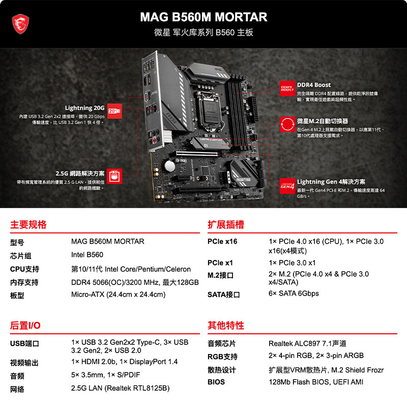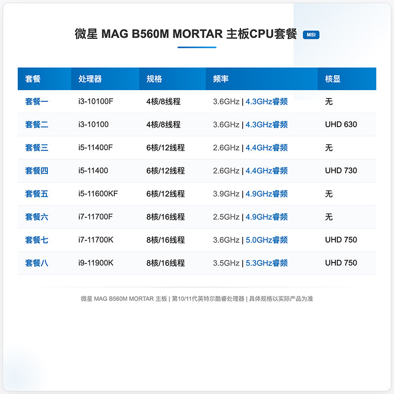 11400 i9主板CPU套装 11600KF 11700K 微星B560M迫击炮搭配i5
