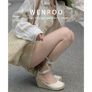厚底亚麻草编渔夫鞋 新款 女2026夏季 编织镂空绑带包头坡跟高跟凉鞋