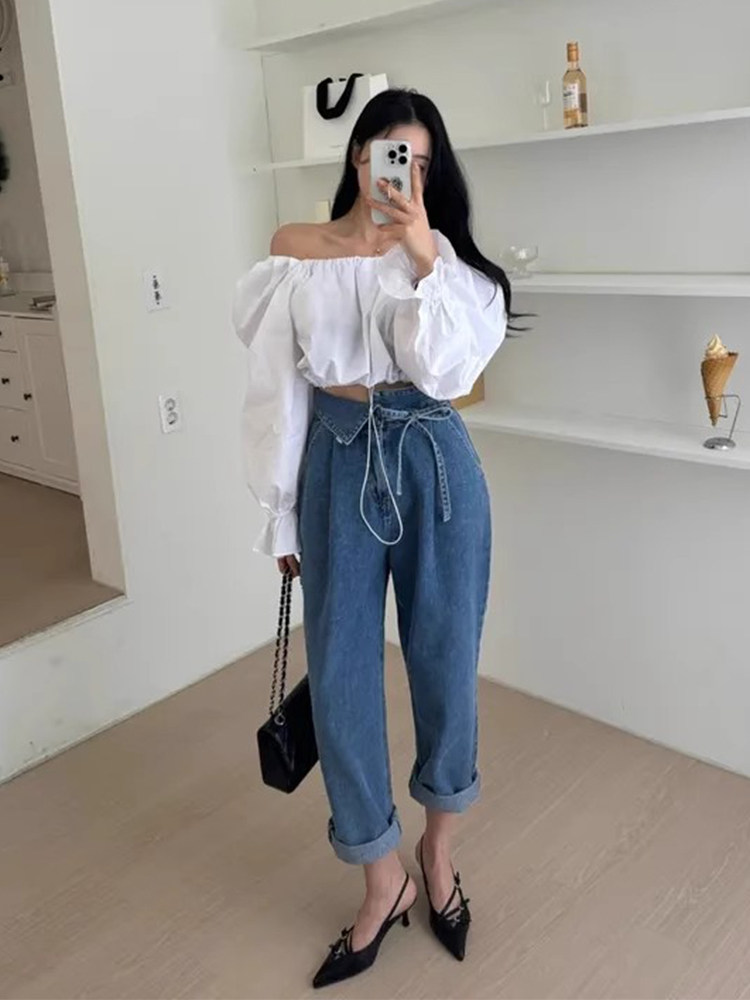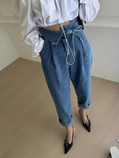 女春季 长裤 新款 复古气质直筒哈伦裤 韩版 小众设计感翻腰绑带牛仔裤