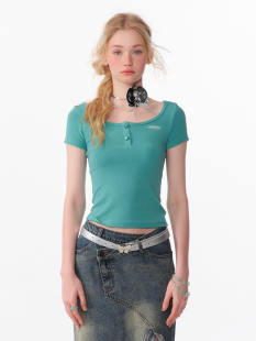 T恤女 显瘦正肩上衣简约短袖 ziziFei夏美式 复古绿色基础大U领修身