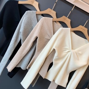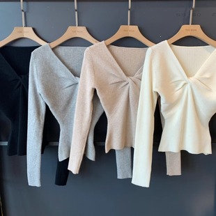 显瘦针织打底衫 THEWOW 版 柔软细腻V领胸前扭结收腰修身 简约篙级