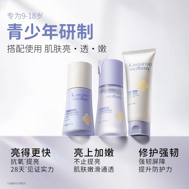 袋鼠妈妈青少年保湿 补水学生改善暗黄肌肤舒缓焕亮 滋润护肤套装