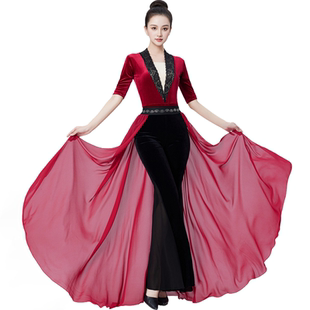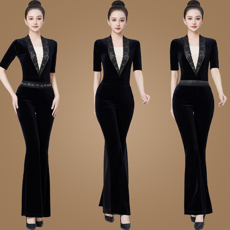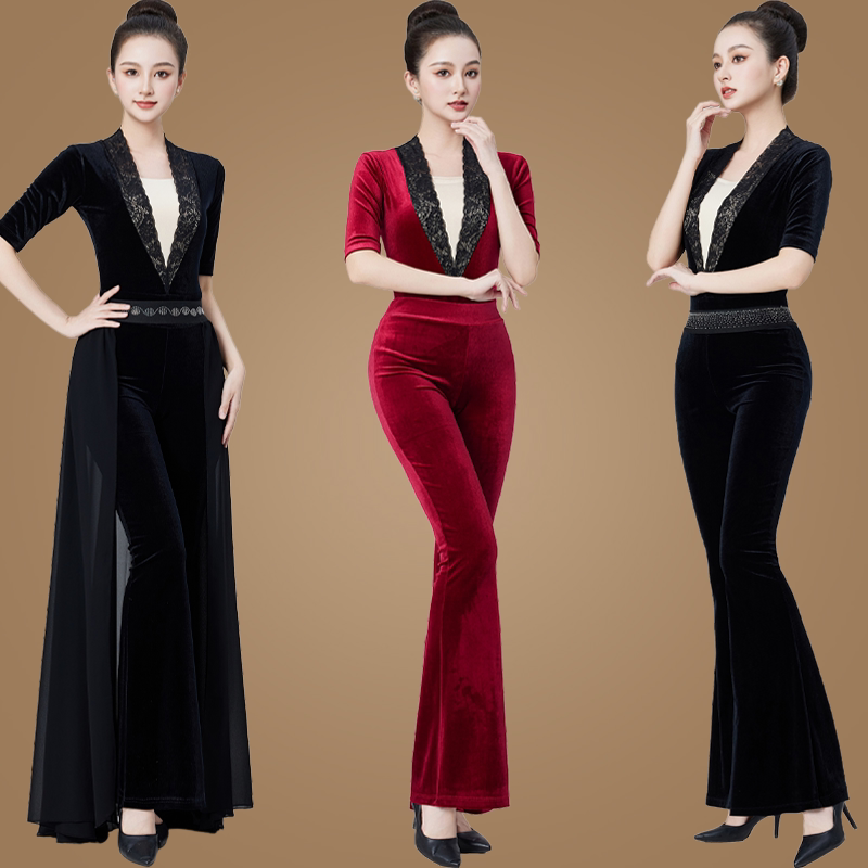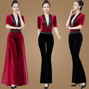 女礼仪走秀修身 舞蹈练功服丝绒套装 优雅新品 喇叭裤 款 形体训练服装