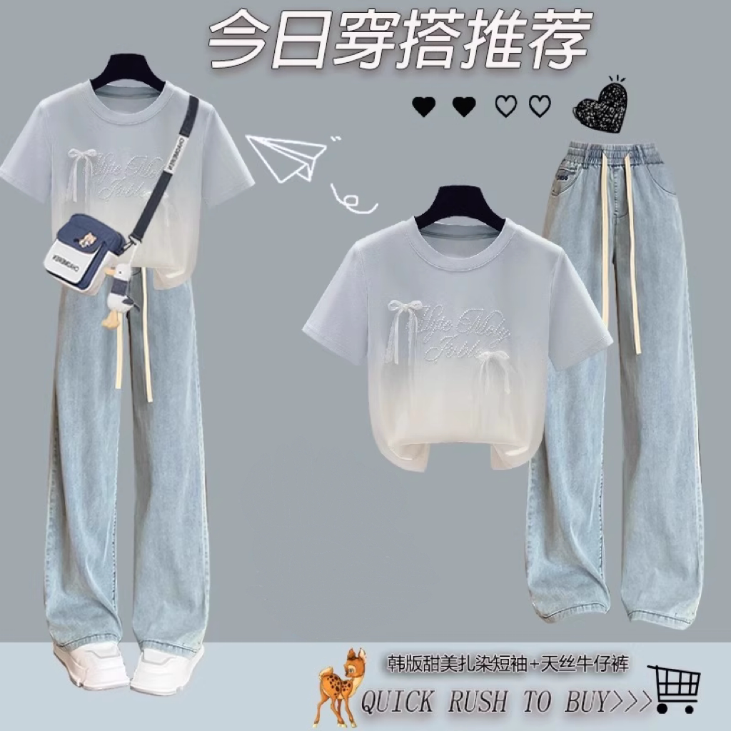 初高中学生阔腿牛仔裤 新款 两件套 T恤2025夏装 女童学院风甜美短袖