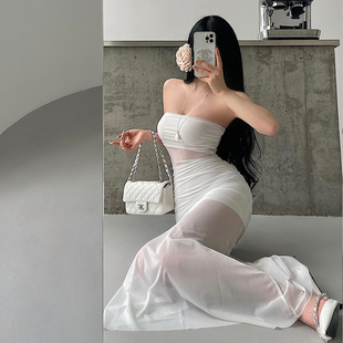 YoungGirlDay纯欲辣妹风性感交叉挂脖镂空长袖 针织包臀连衣裙长裙