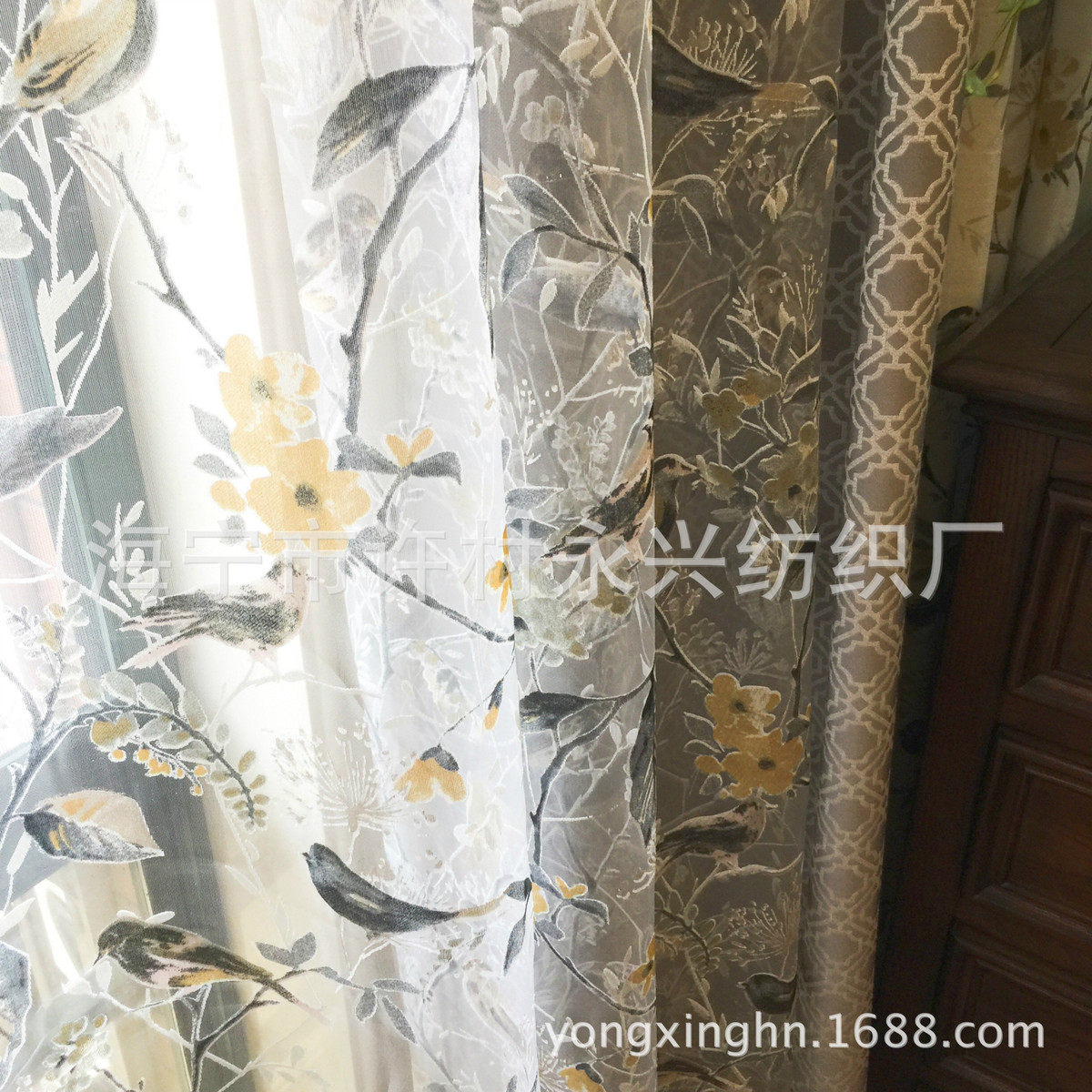 棉麻中式 花印花提花卧室客厅成品窗帘布料烂黄色窗纱雀鸟 美式