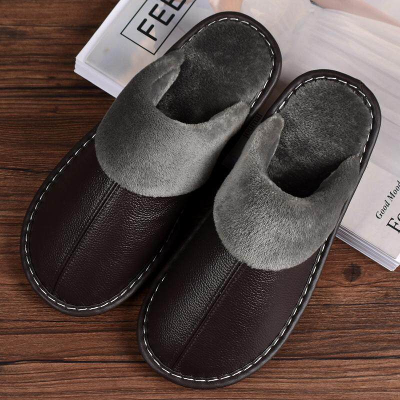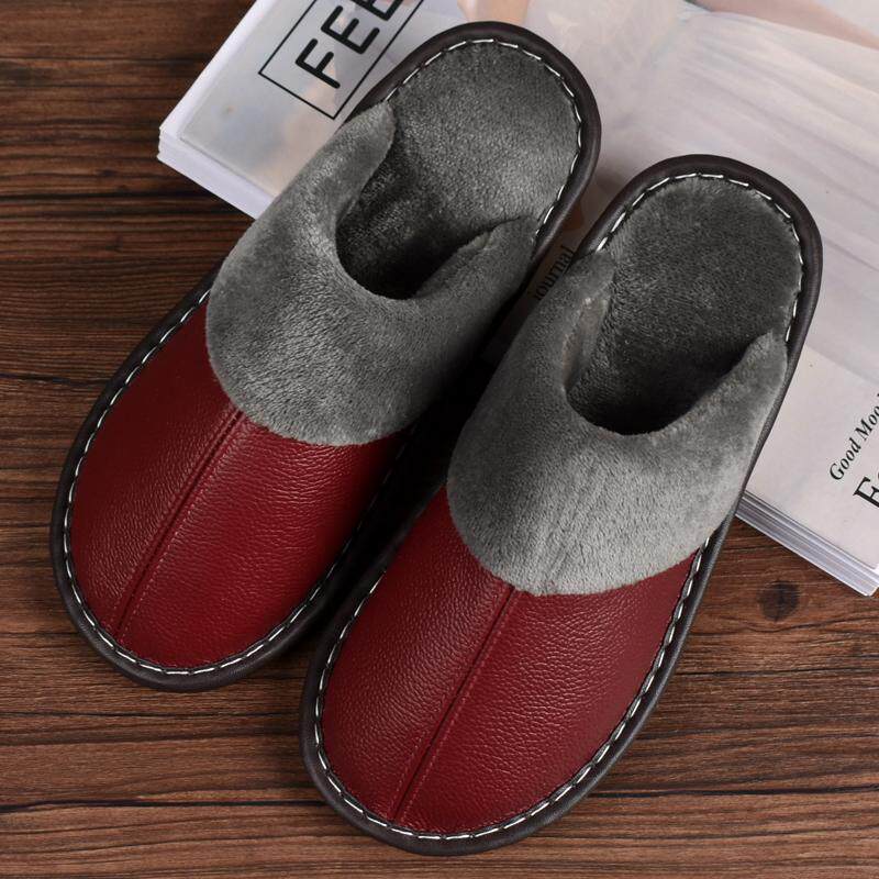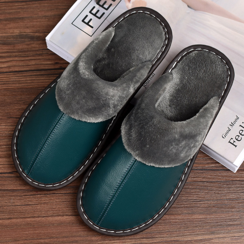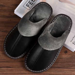 男女情侣室内加绒加厚保暖防滑棉拖鞋 头层牛皮真皮居家拖鞋 秋冬季