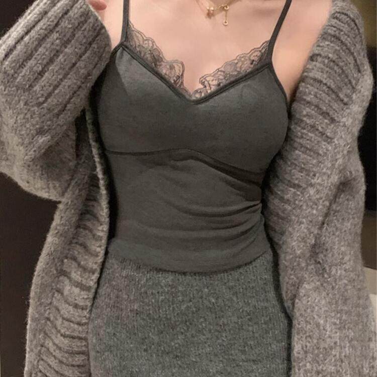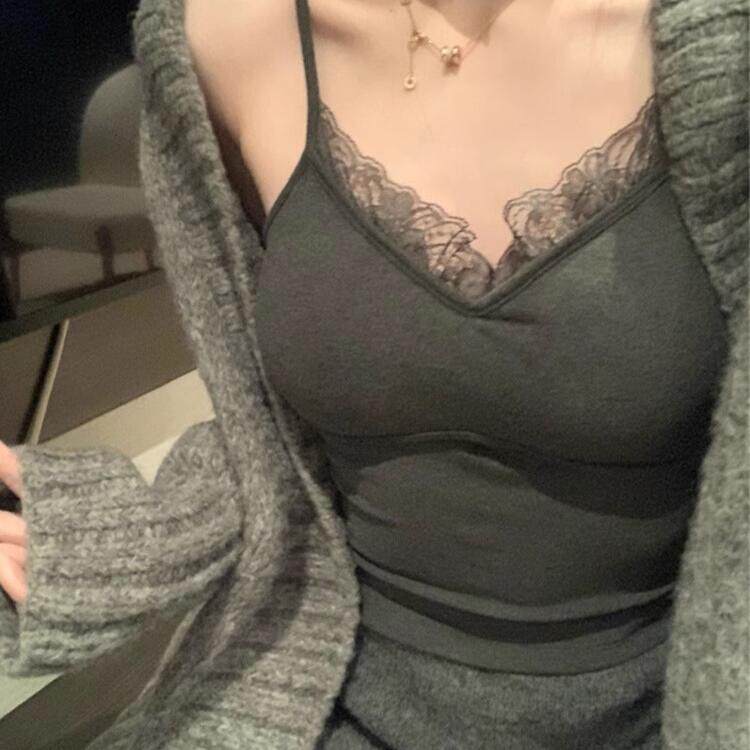 蕾丝拼接吊带背心性感纯欲风美背带胸垫固定杯遮副乳修身 显瘦上衣