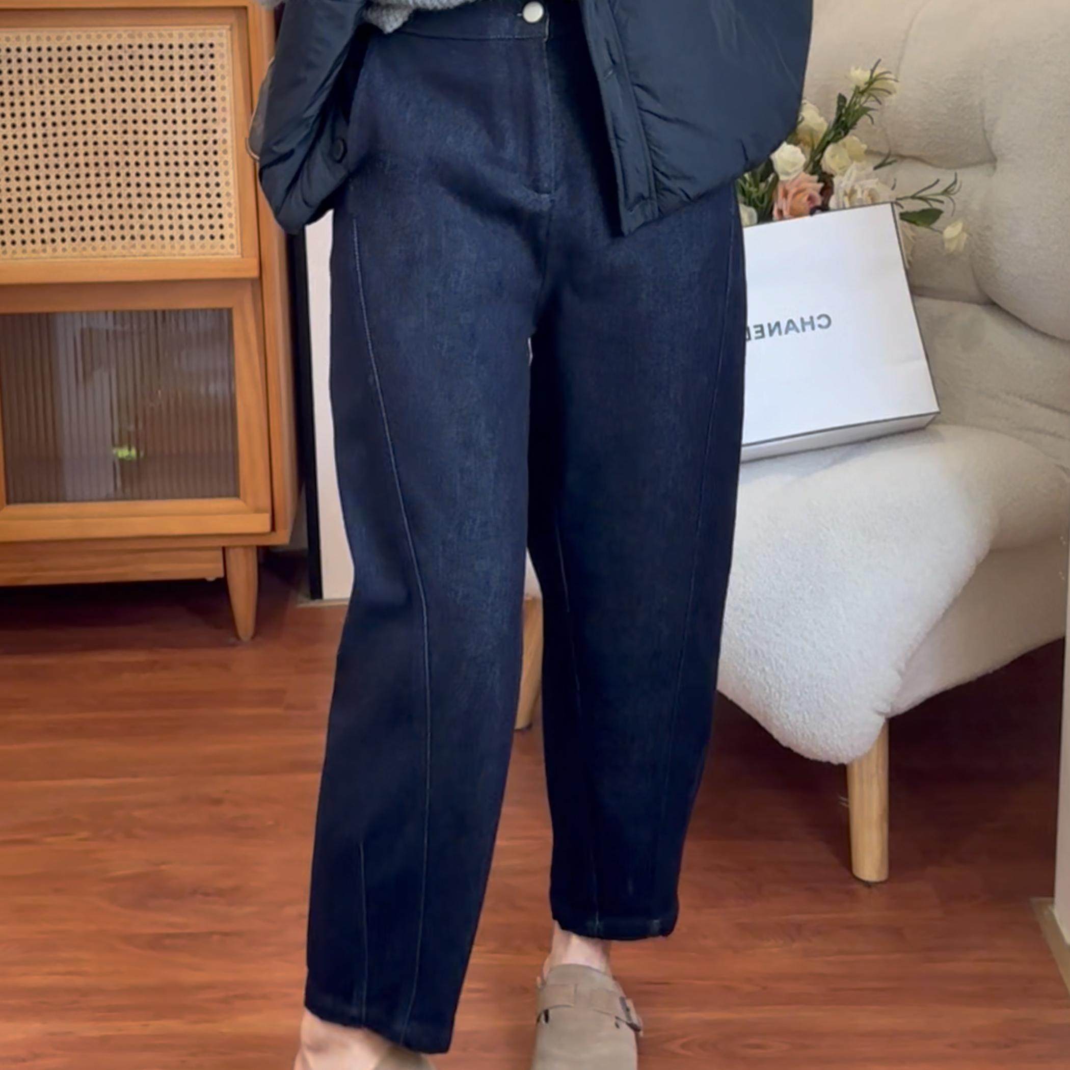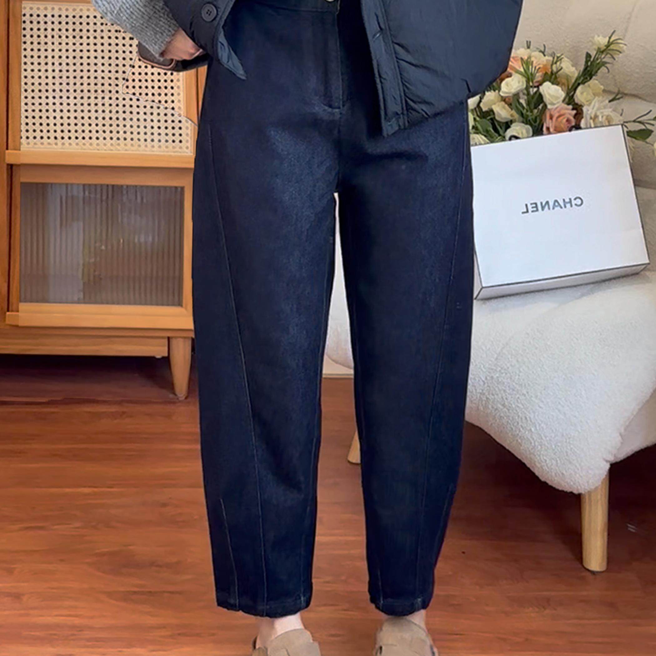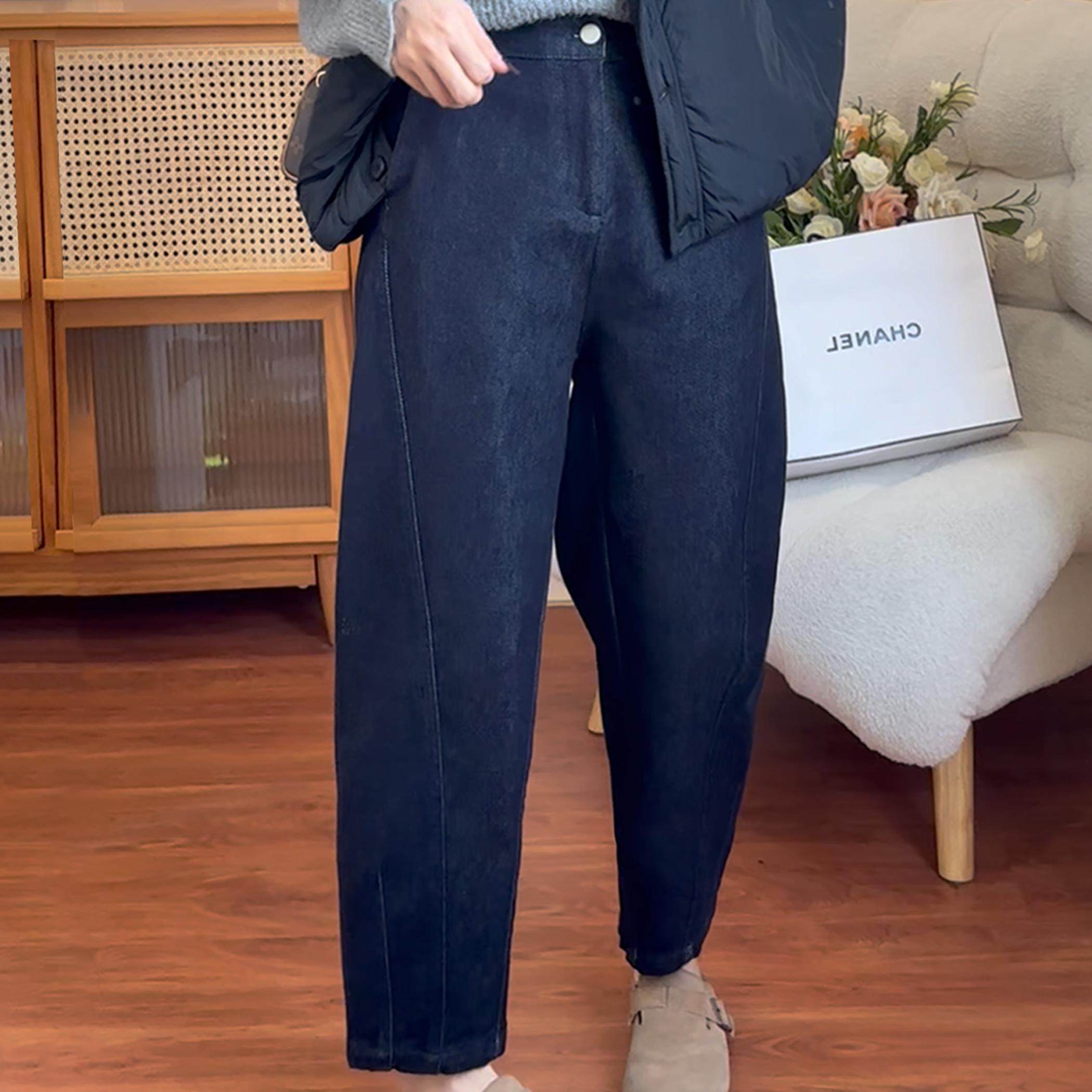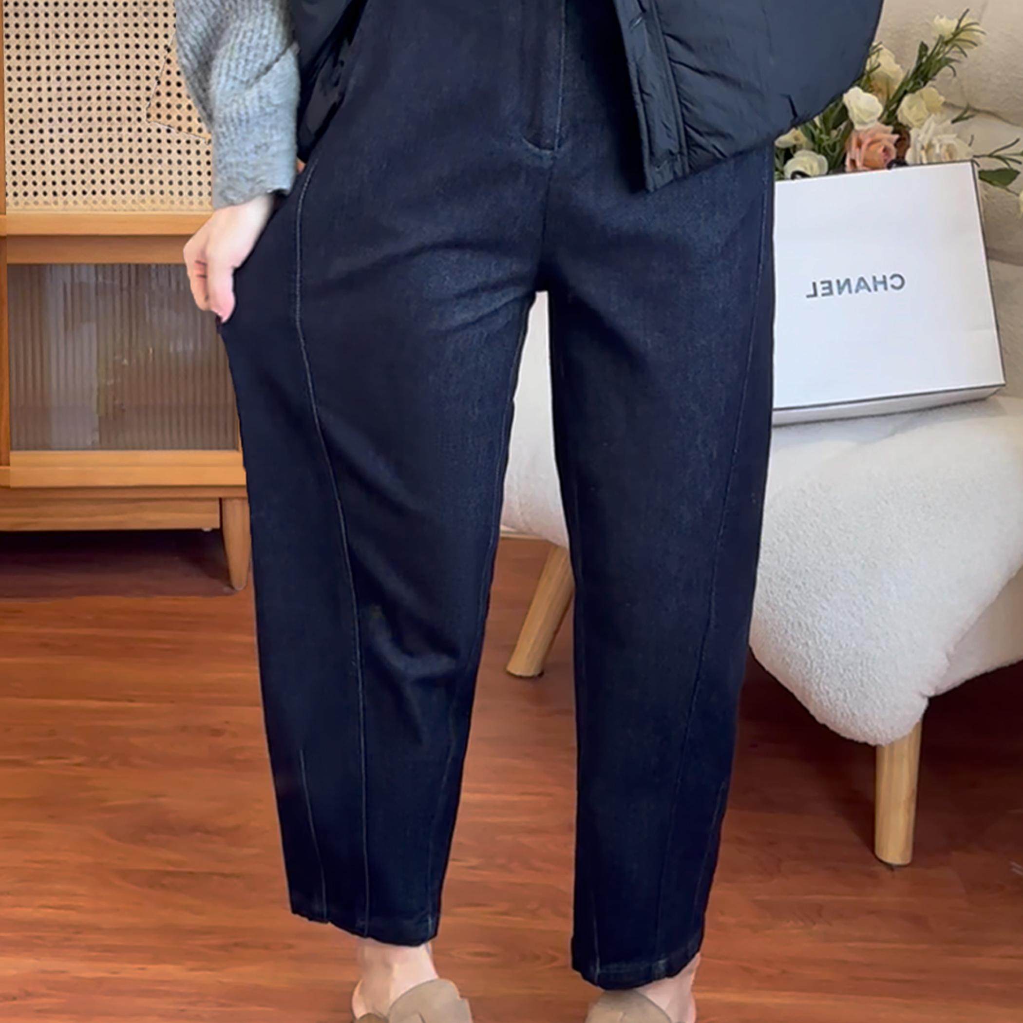 秋冬季 微胖女孩梨型身材宽松百搭显瘦老爹裤 大码 深蓝色哈伦牛仔裤