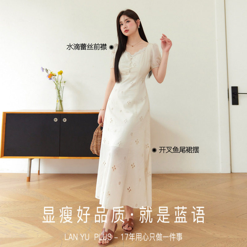 气质绝美镂空鱼尾连衣裙夏季 女装 显瘦仙气a字中长裙 蓝语大码 现货