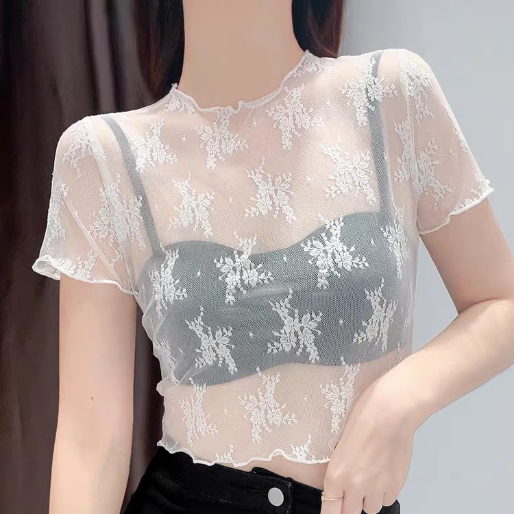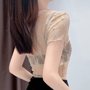 上衣女夏季 蕾丝短款 t恤配吊带裙内搭薄网纱衣打底衫 性感透视短袖