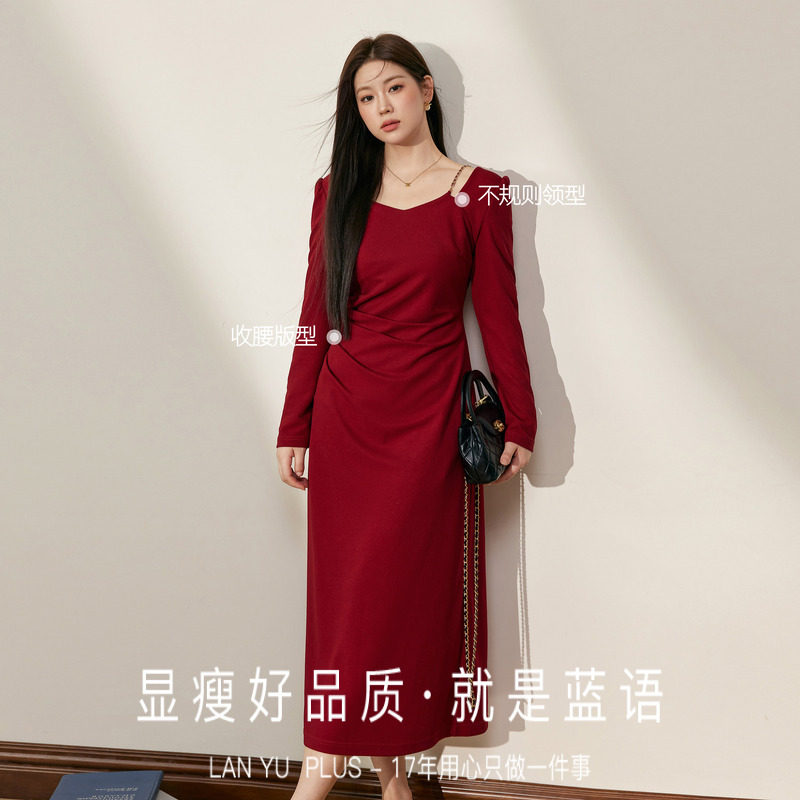 褶皱显瘦a字裙 气质高级感方领红色订婚连衣裙春新款 现货 蓝语大码