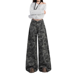 女装 夏季 新款 大码 子宽松显瘦阔腿裤 高街迷彩牛仔裤 百搭裤 胖mm美式