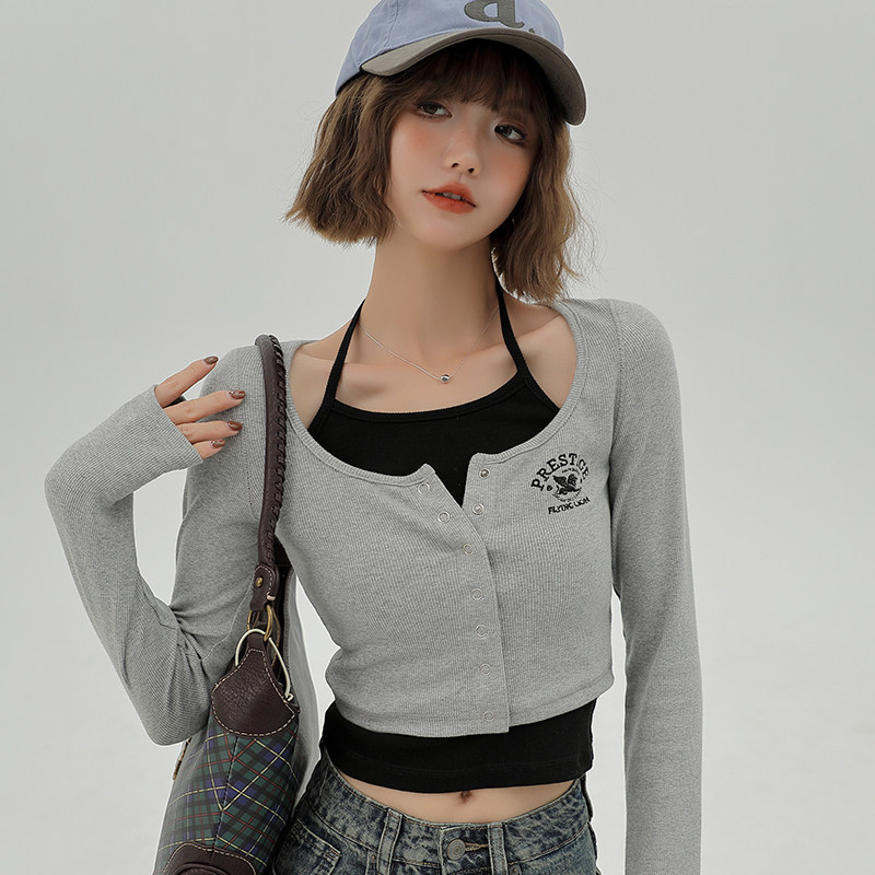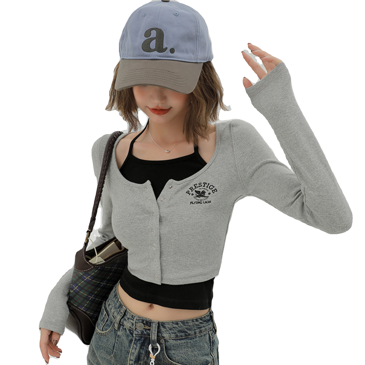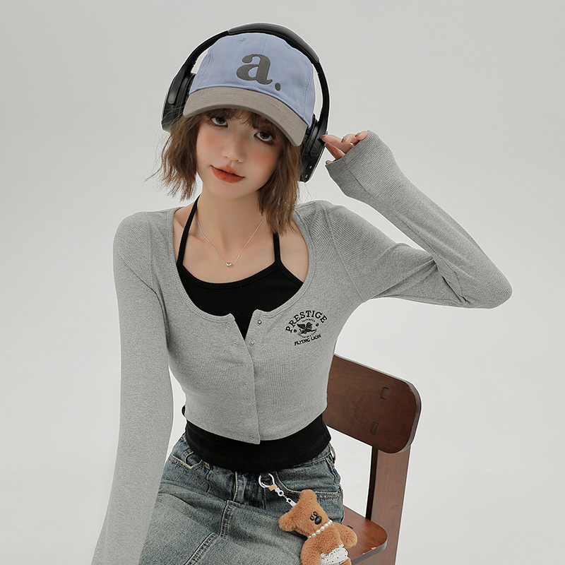 新款 Girlyhalo美式 t恤女2023秋季 两件套长袖 打底上衣 复古辣妹修身