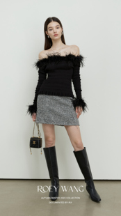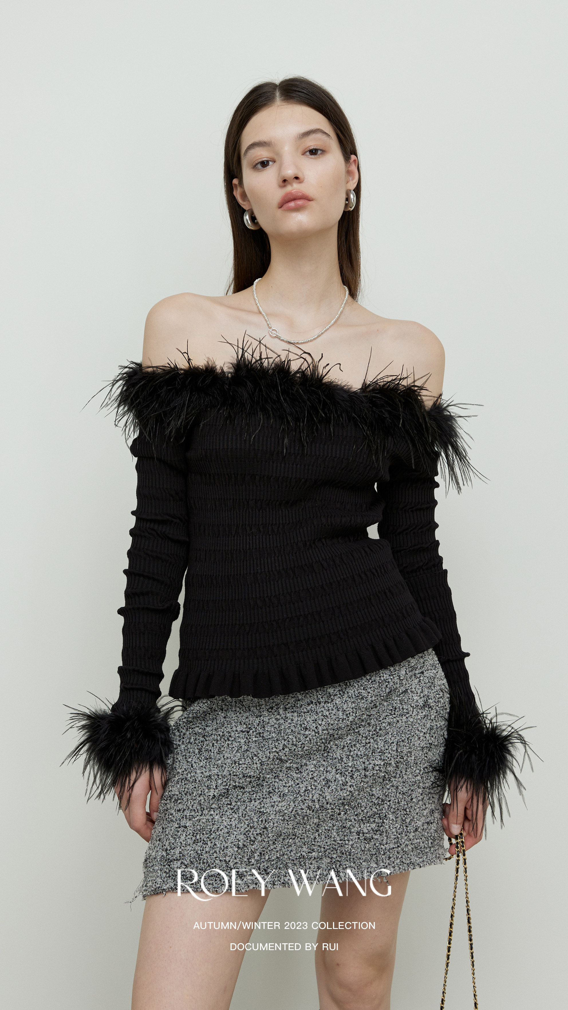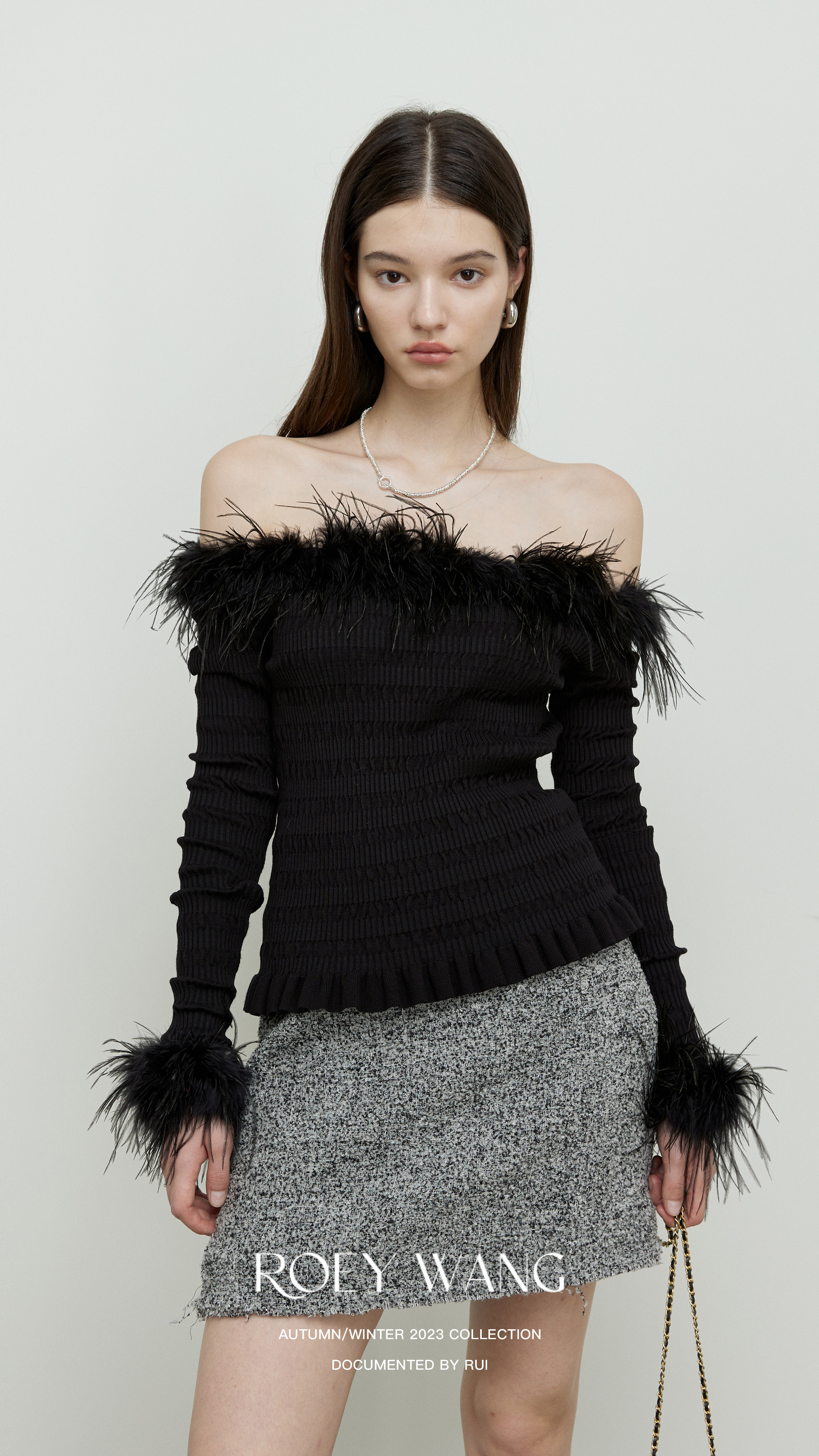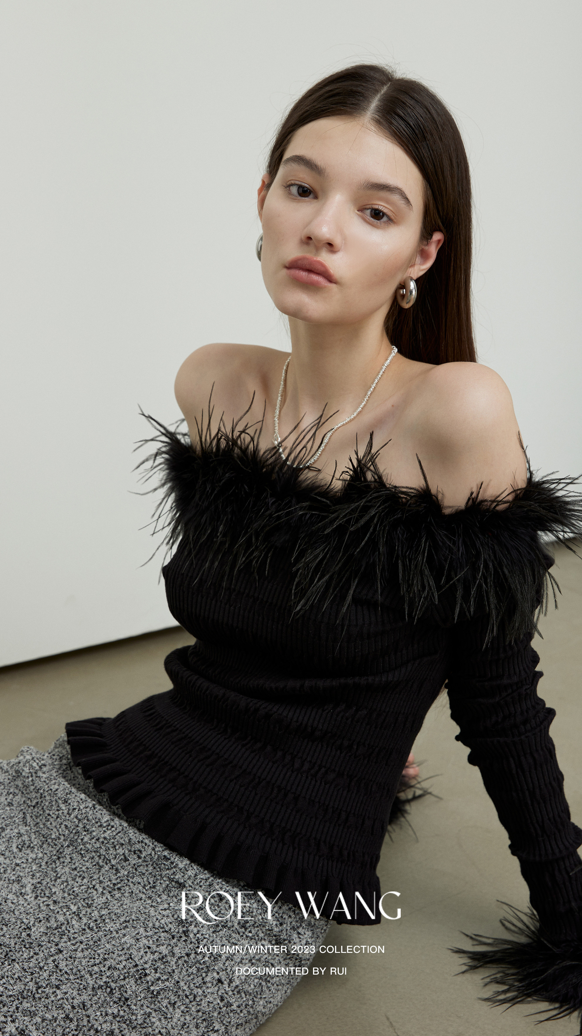 ROEYWANG 弹力上衣 鸵鸟毛不规则肌理感毛织针织打底衫