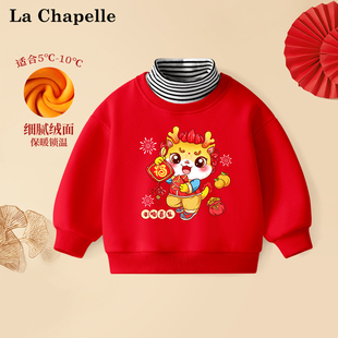拉夏贝尔儿童红色加绒卫衣秋冬款 拜年服马年上衣服厚 新年宝宝冬季