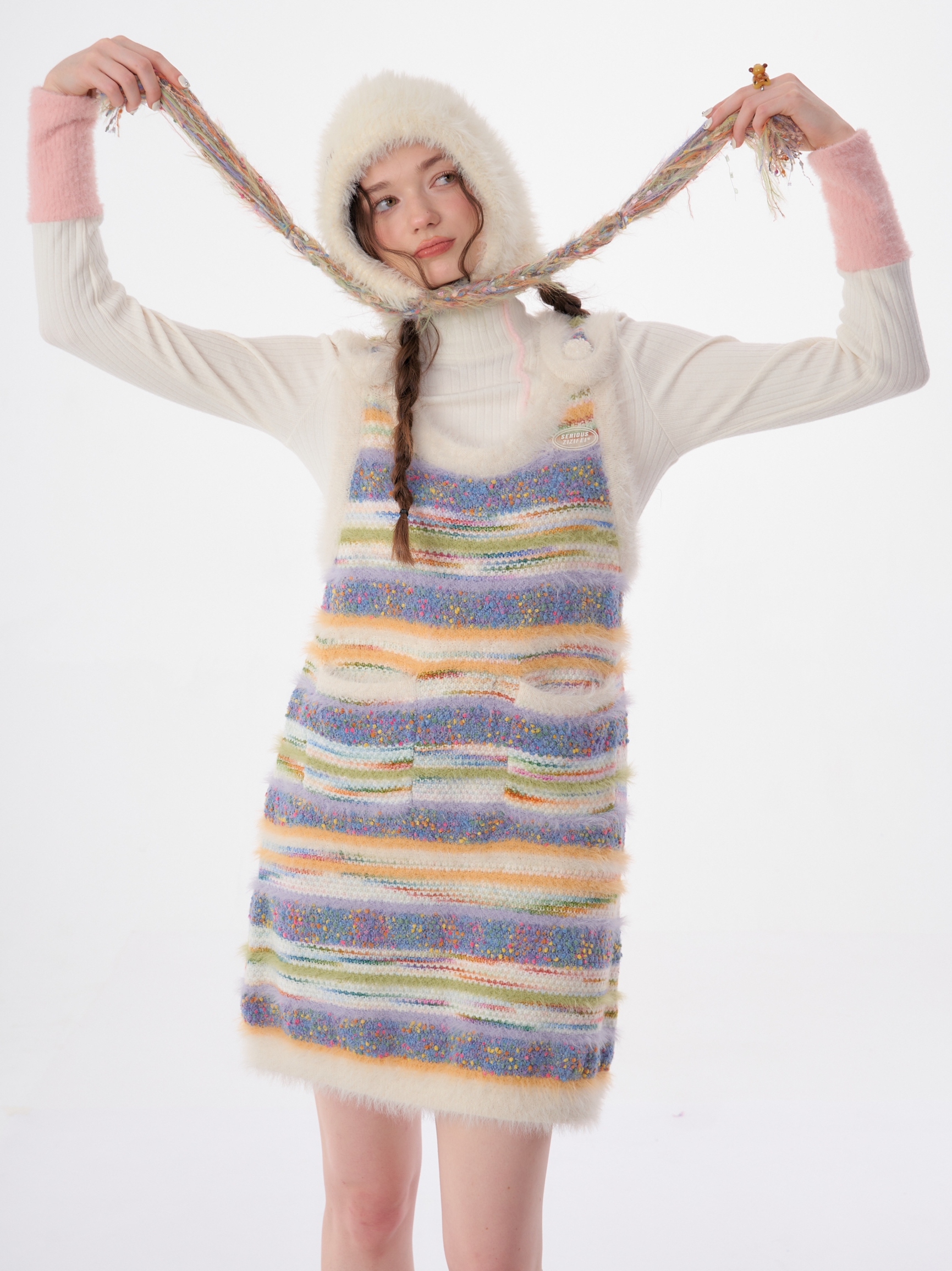 ziziFei秋冬美式 长裙毛毛连衣裙女 复古彩色颗粒条纹针织背心无袖