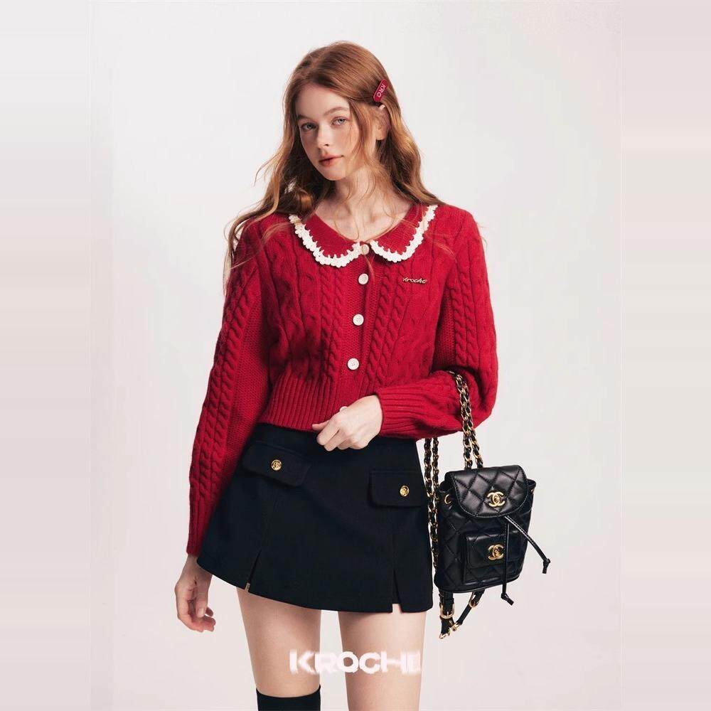 时髦叠穿短款 屁帘女秋冬季 针织半身裙 胖mm立体钩编绑带一片式 大码