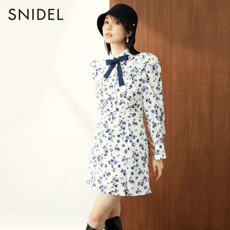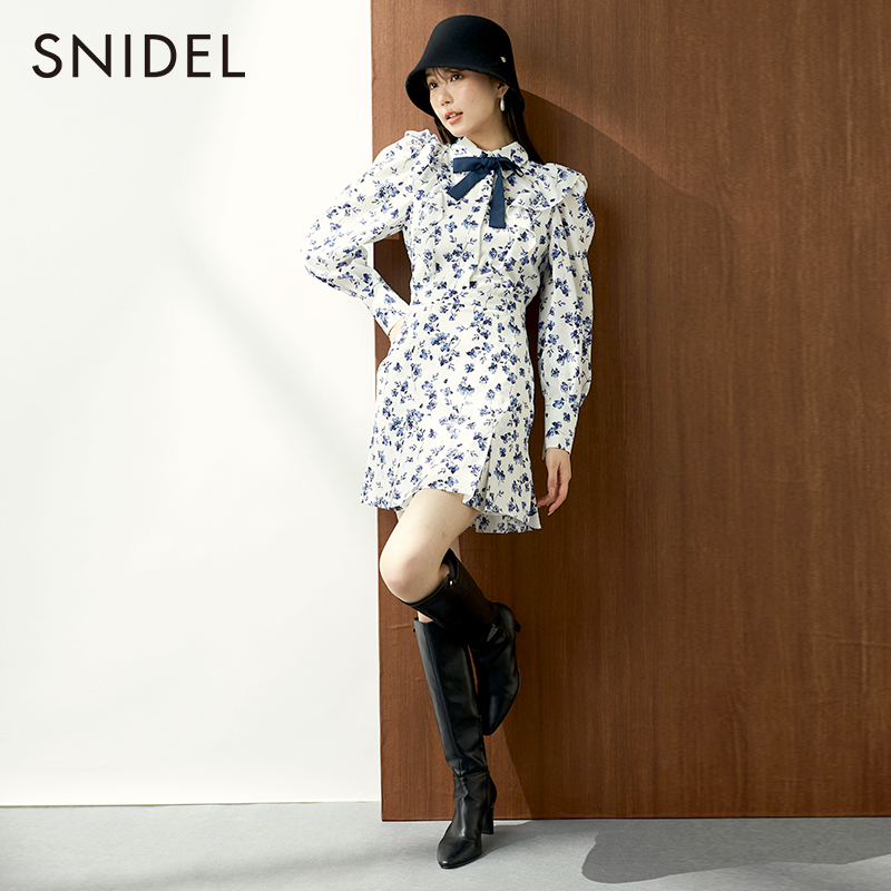 SNIDEL秋冬甜美优雅荷叶边泡泡袖 翻领带领结印花连衣裙SWFO235069