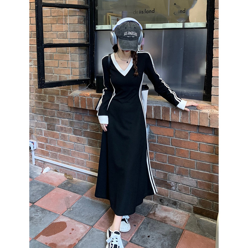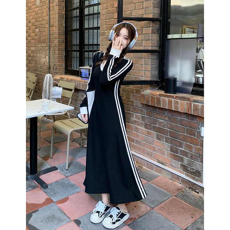 高级感a字长裙子 t恤打底裙连衣裙女韩版 大码 胖mm早秋条纹V领长袖