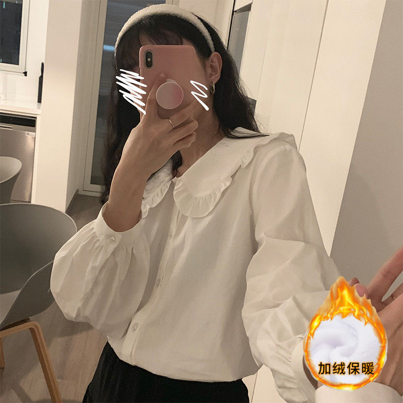 复古娃娃领泡泡袖 法式 设计感小众衬衣女 加绒加厚秋冬新款 胖薯大码
