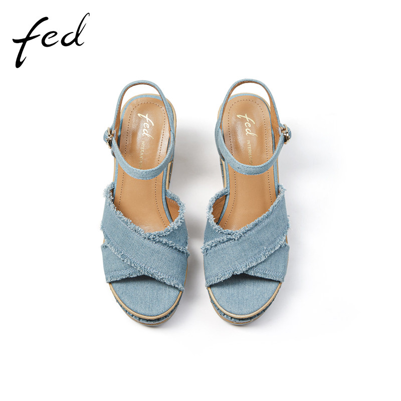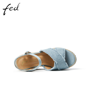 女鞋 新款 牛仔交叉带坡跟凉鞋 女款 ZF018 fed松糕厚底凉鞋 R0624 夏季