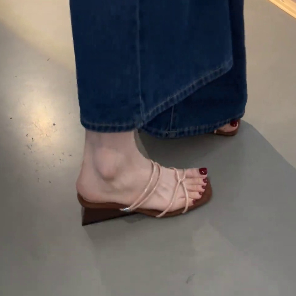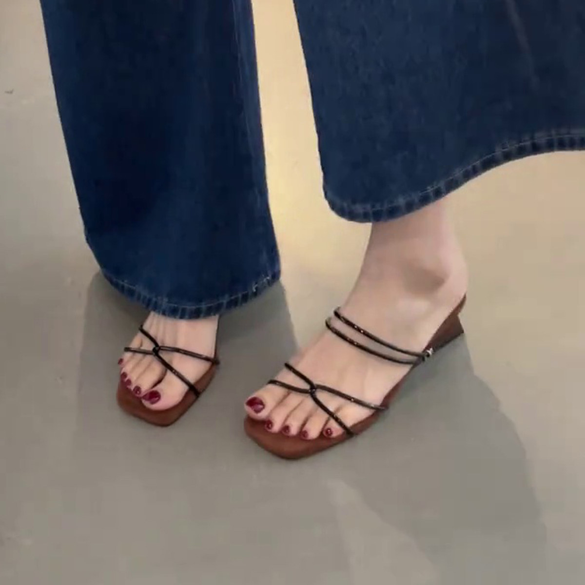 露趾配裙子罗马凉鞋 气质一字带两穿坡跟凉拖鞋 女 方头法式 羊皮版