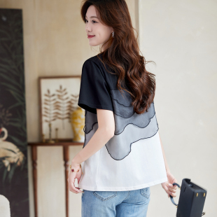 洋气设计感休闲百搭上衣女装 宝诗黎圆领网纱拼接短袖 T恤2026夏季