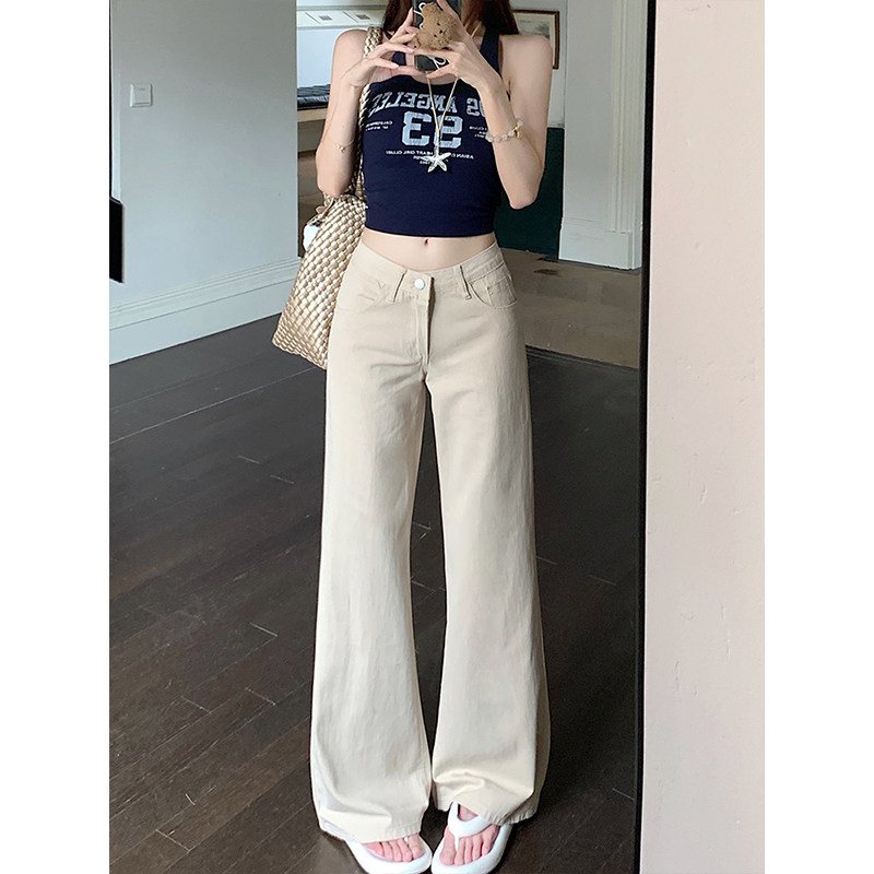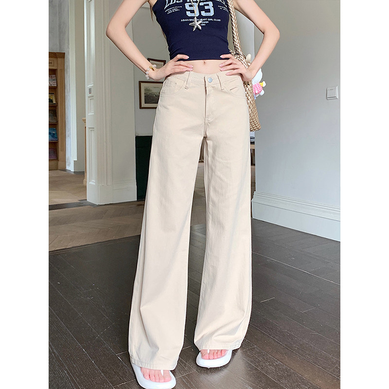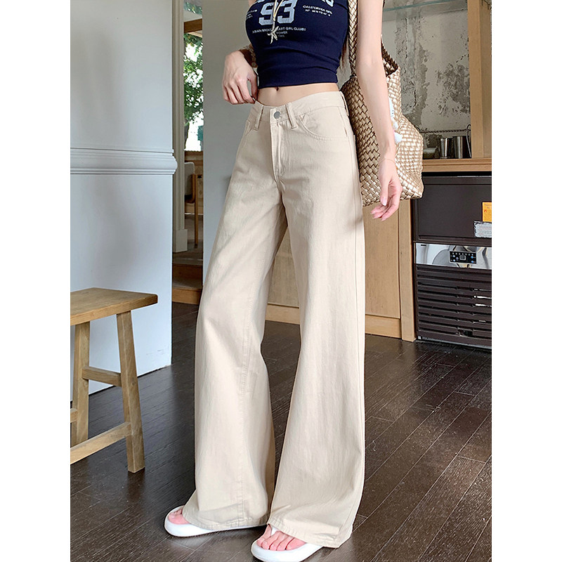 子 女低腰辣妹显瘦直筒垂感拖地裤 145小个子韩版 卡其色阔腿牛仔裤