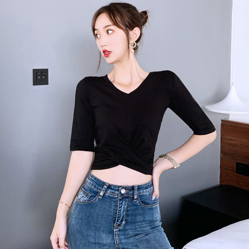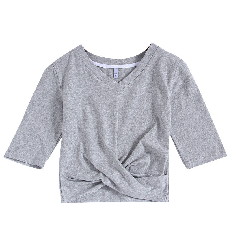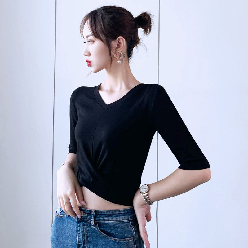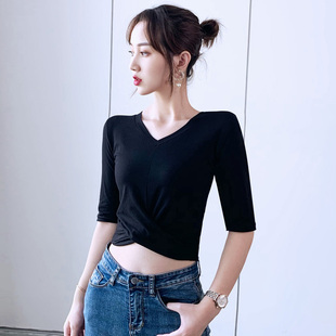 瑜伽舞蹈服短款 纯棉打底衫 露肚脐紧身上衣女春秋 t恤中袖 V领五分袖