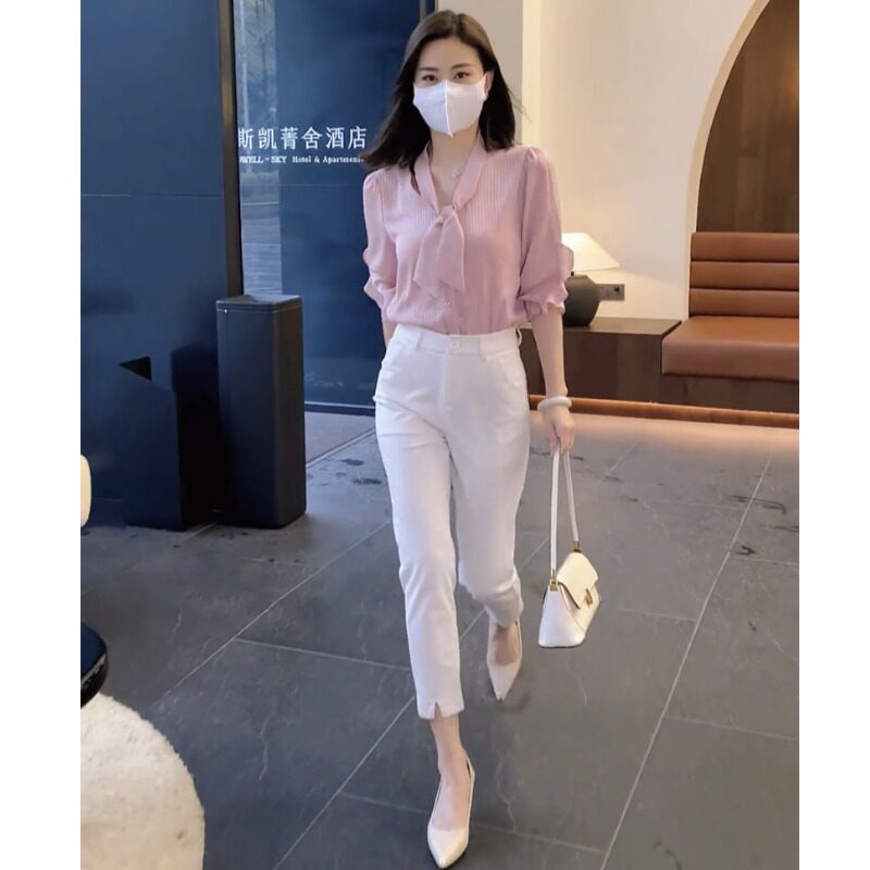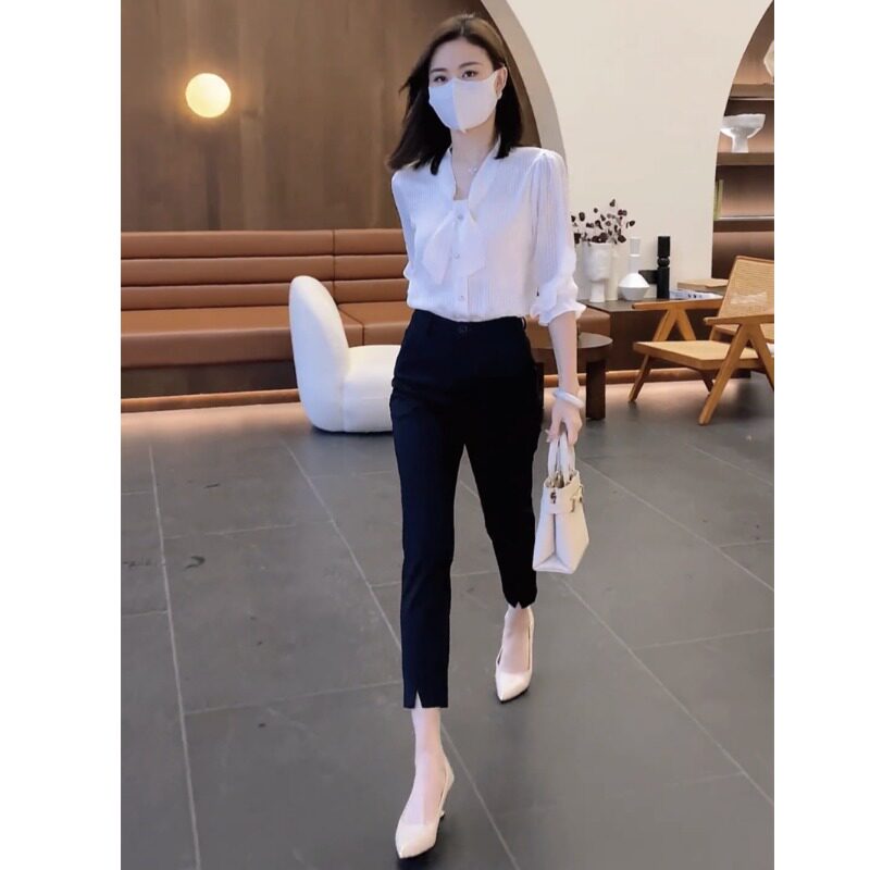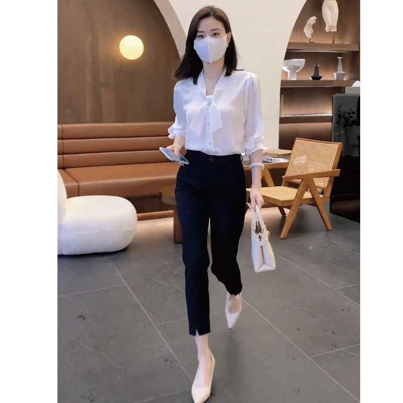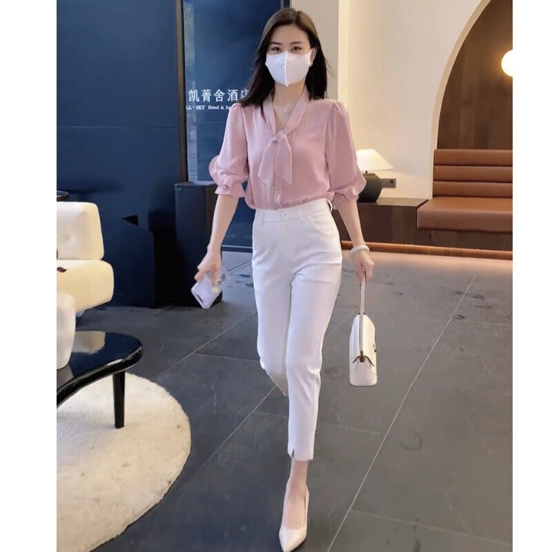 气质御姐职业女套装 2023夏新款 高腰九分小脚裤 衬衫 条纹领结半袖