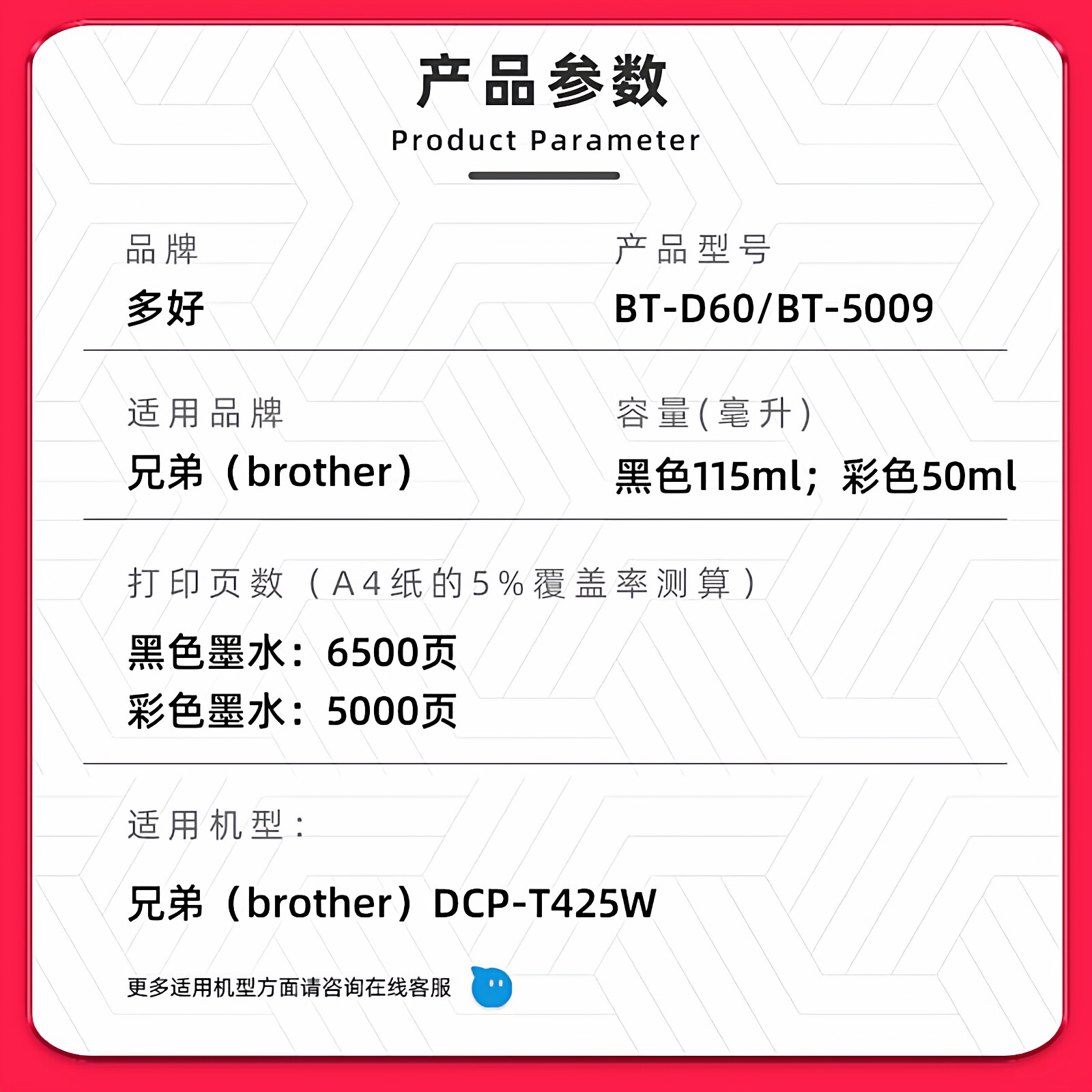 适用兄弟 T425W墨水 DCP brother打印机墨水T425W黑色 多好原装