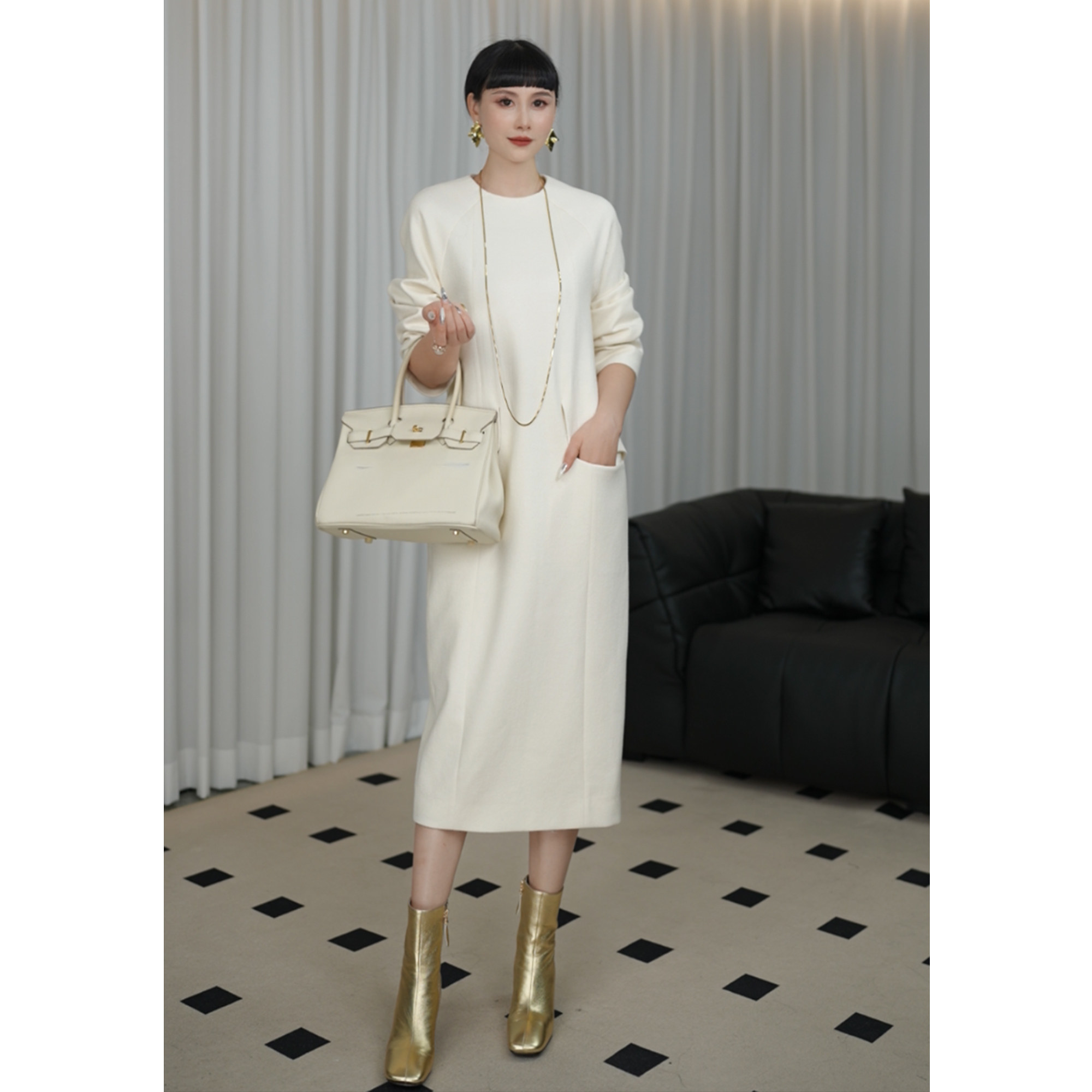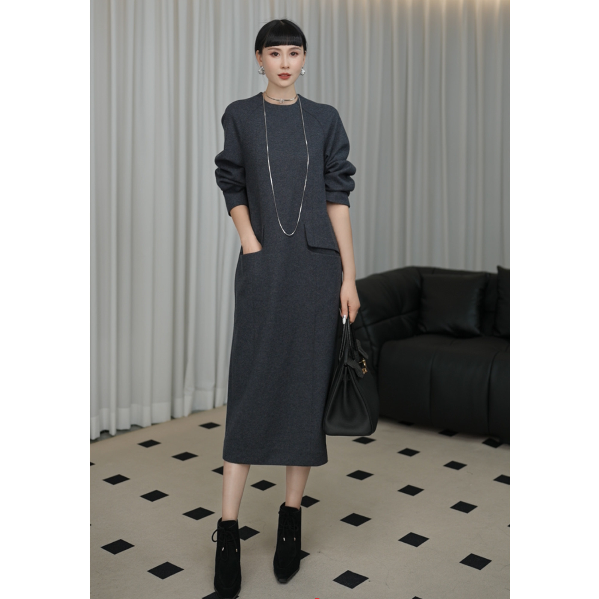 新款 连衣裙子女装 国际流行高级感气质大码 精纺羊毛呢长款 长袖 冬季