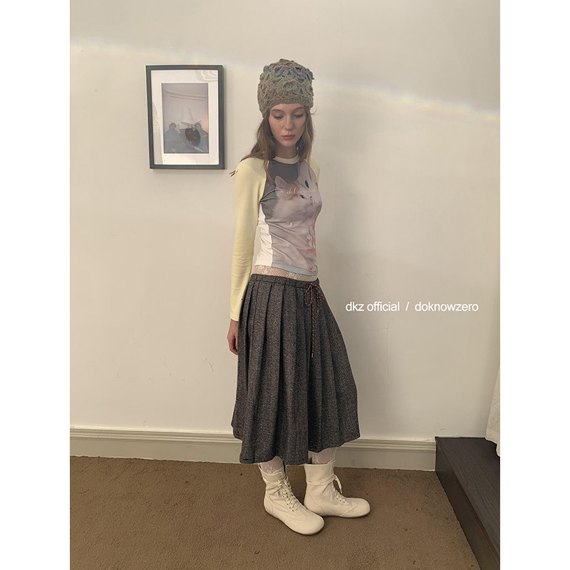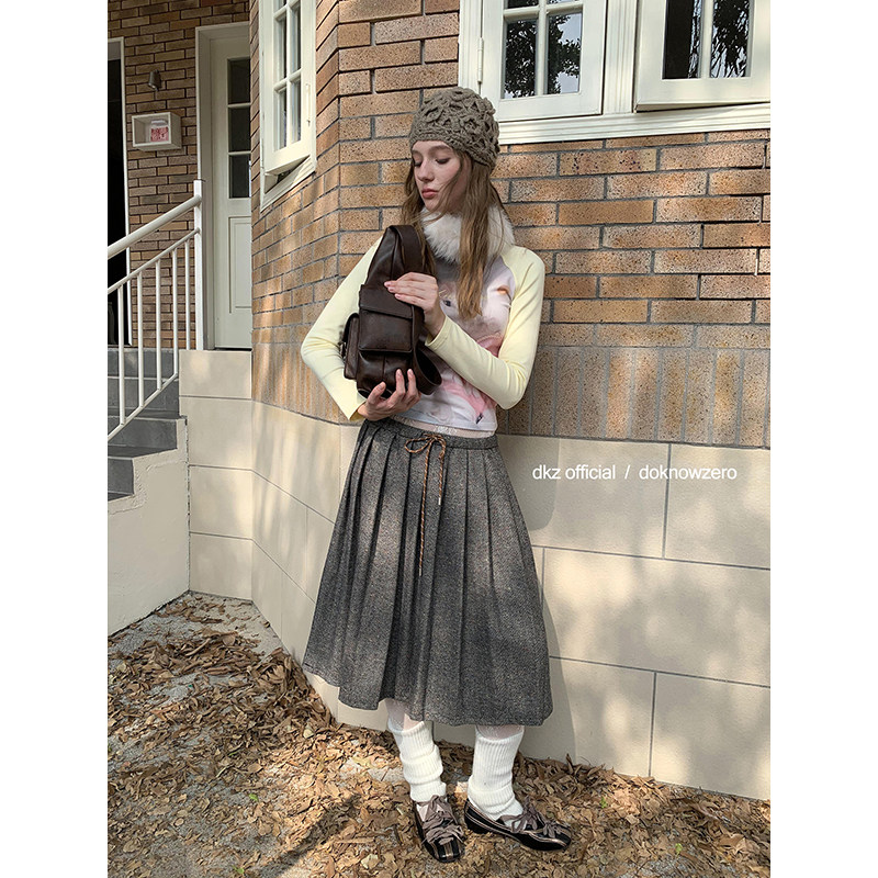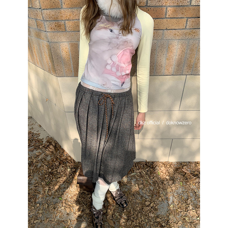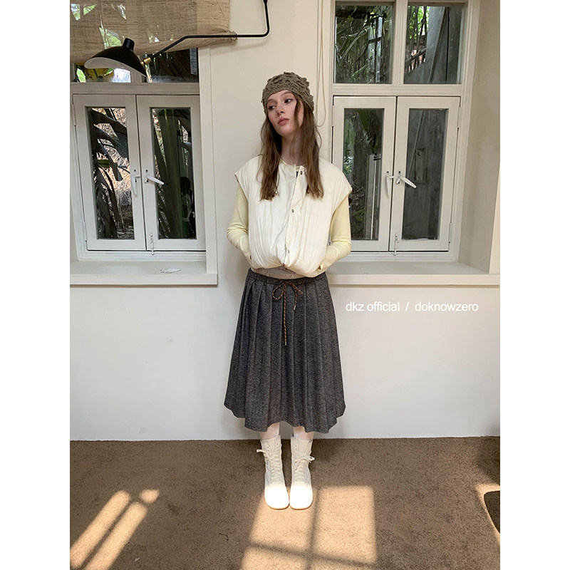 DKZ 宽松抽绳中长裙 复古混色毛呢半身裙女秋冬新款