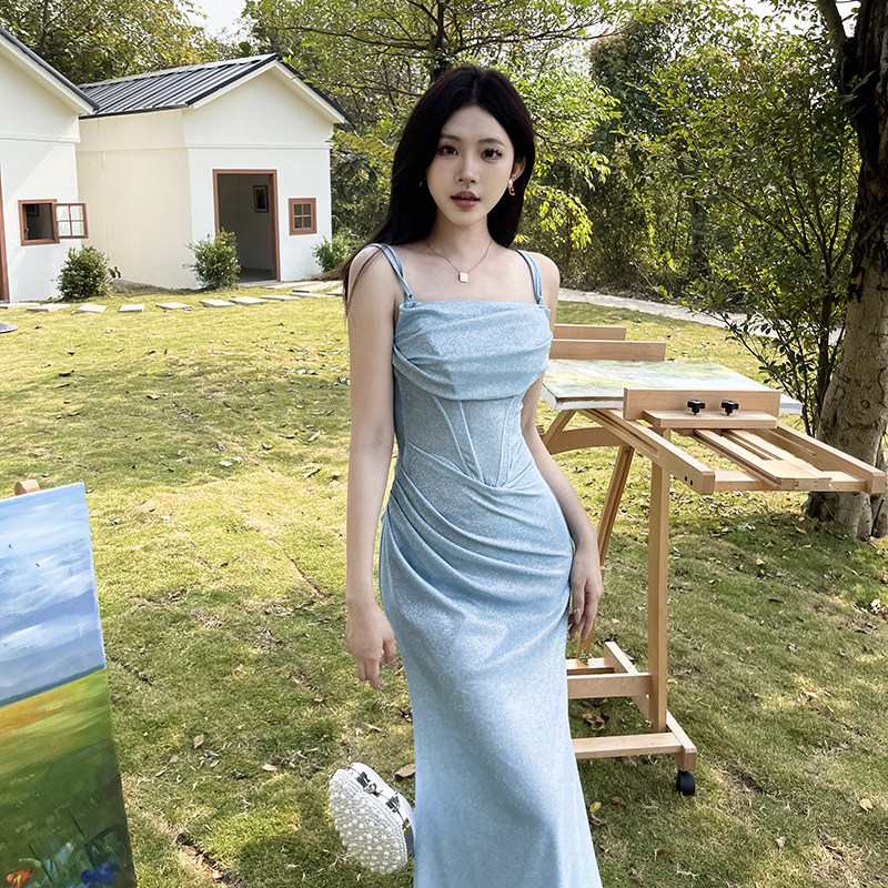 小可wiwi法式 气质蓝色连衣裙女性感绝美生日派对宴会晚礼服 修身