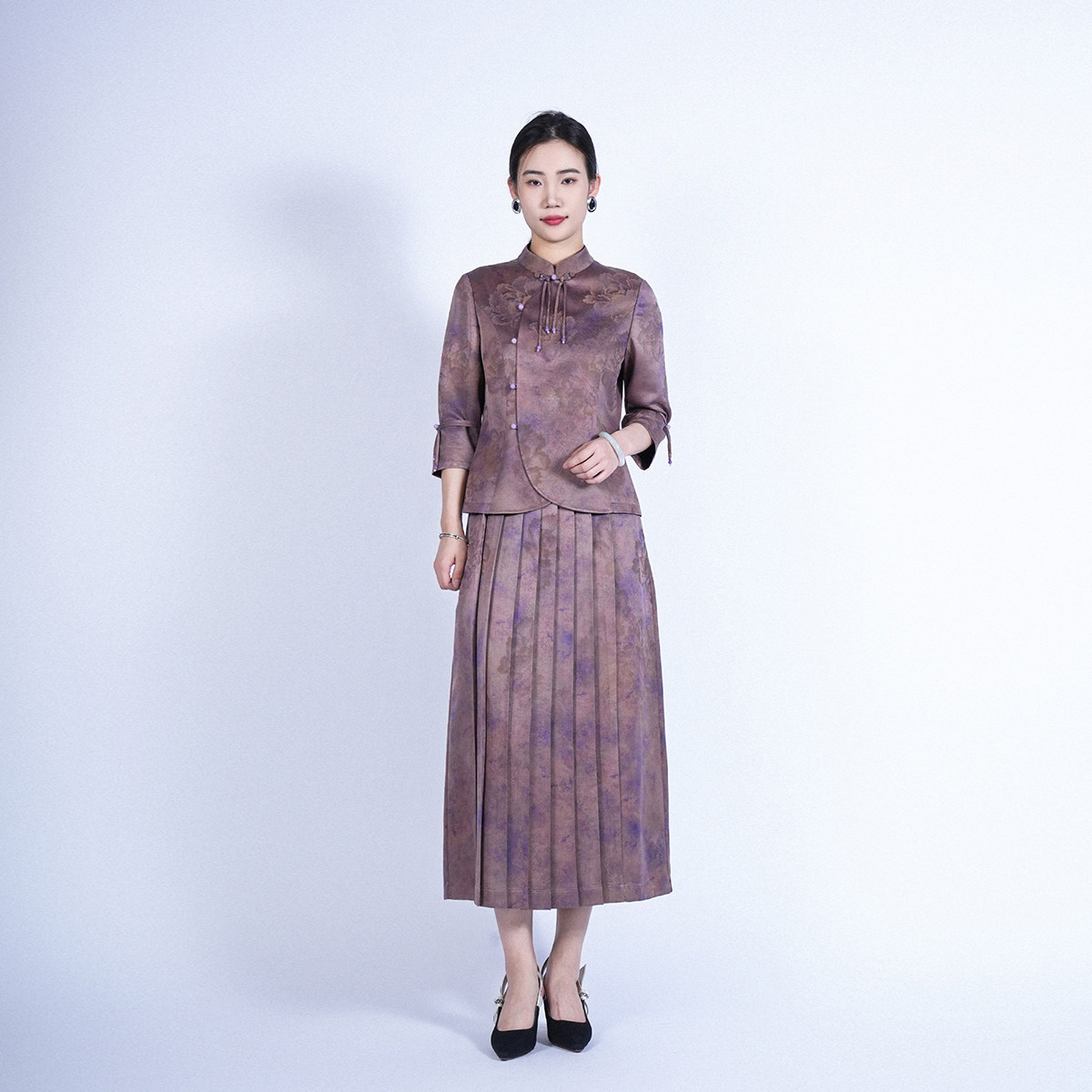 女春夏 国风香云纱套装 浒城古娘新款 桑蚕丝立领气质重工压褶新中式