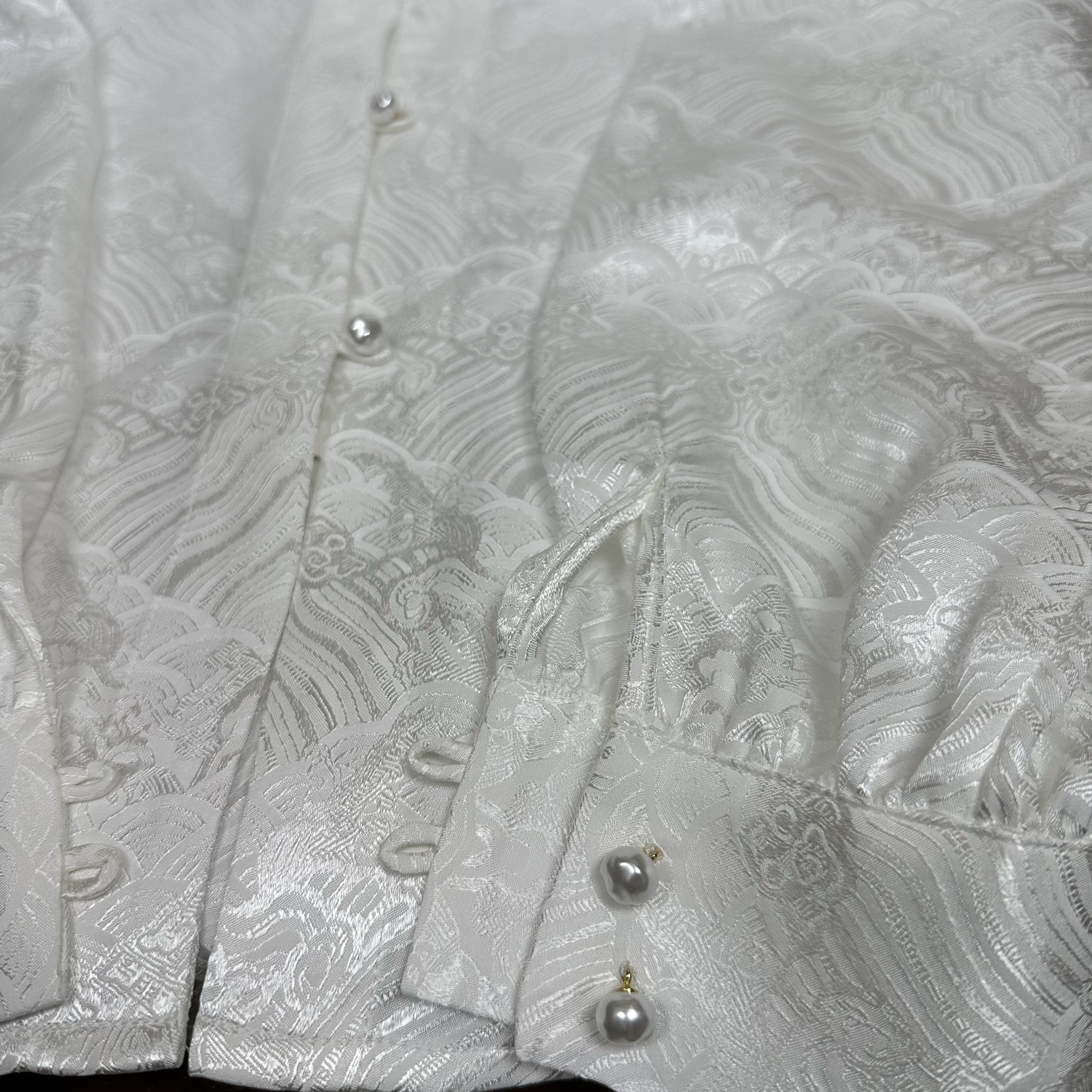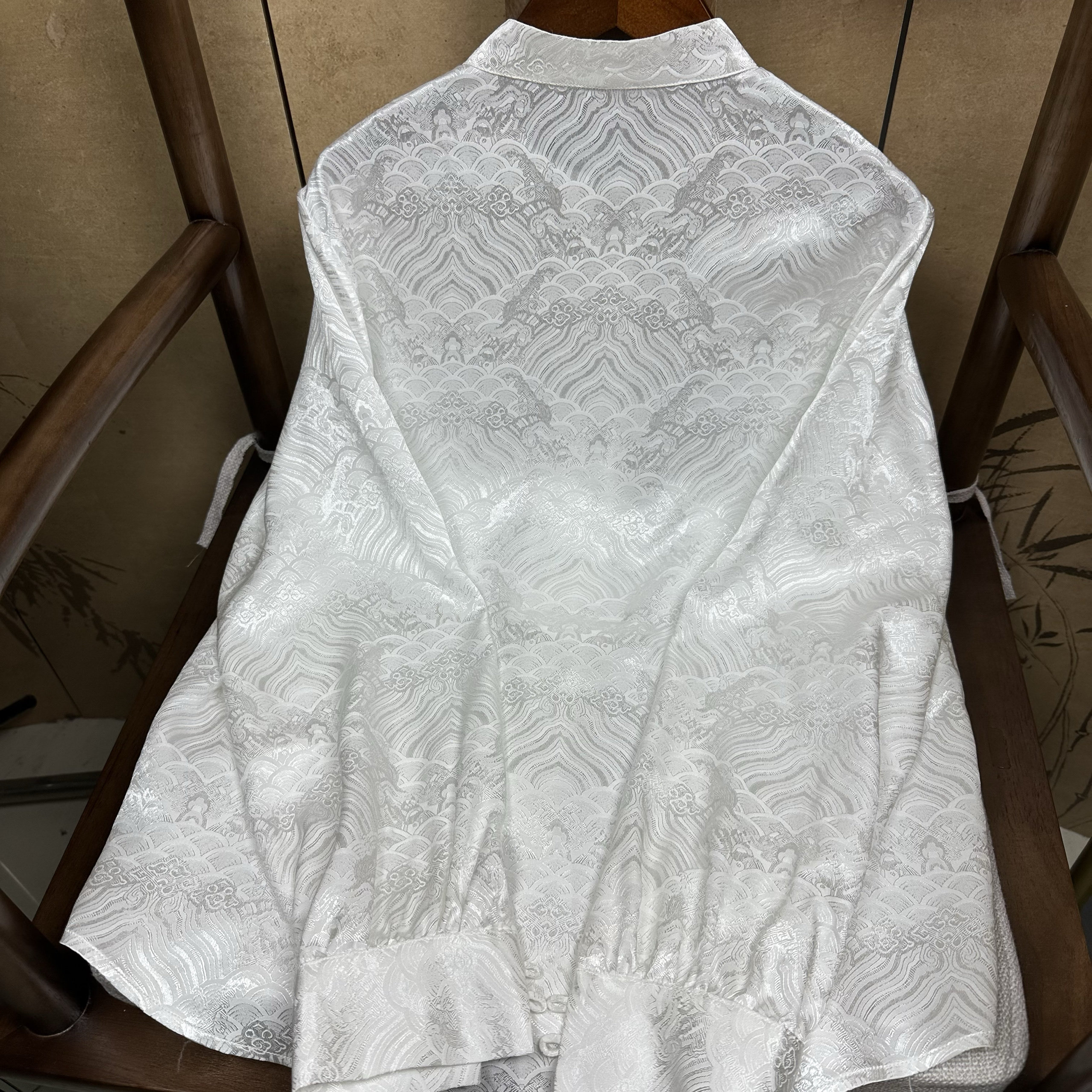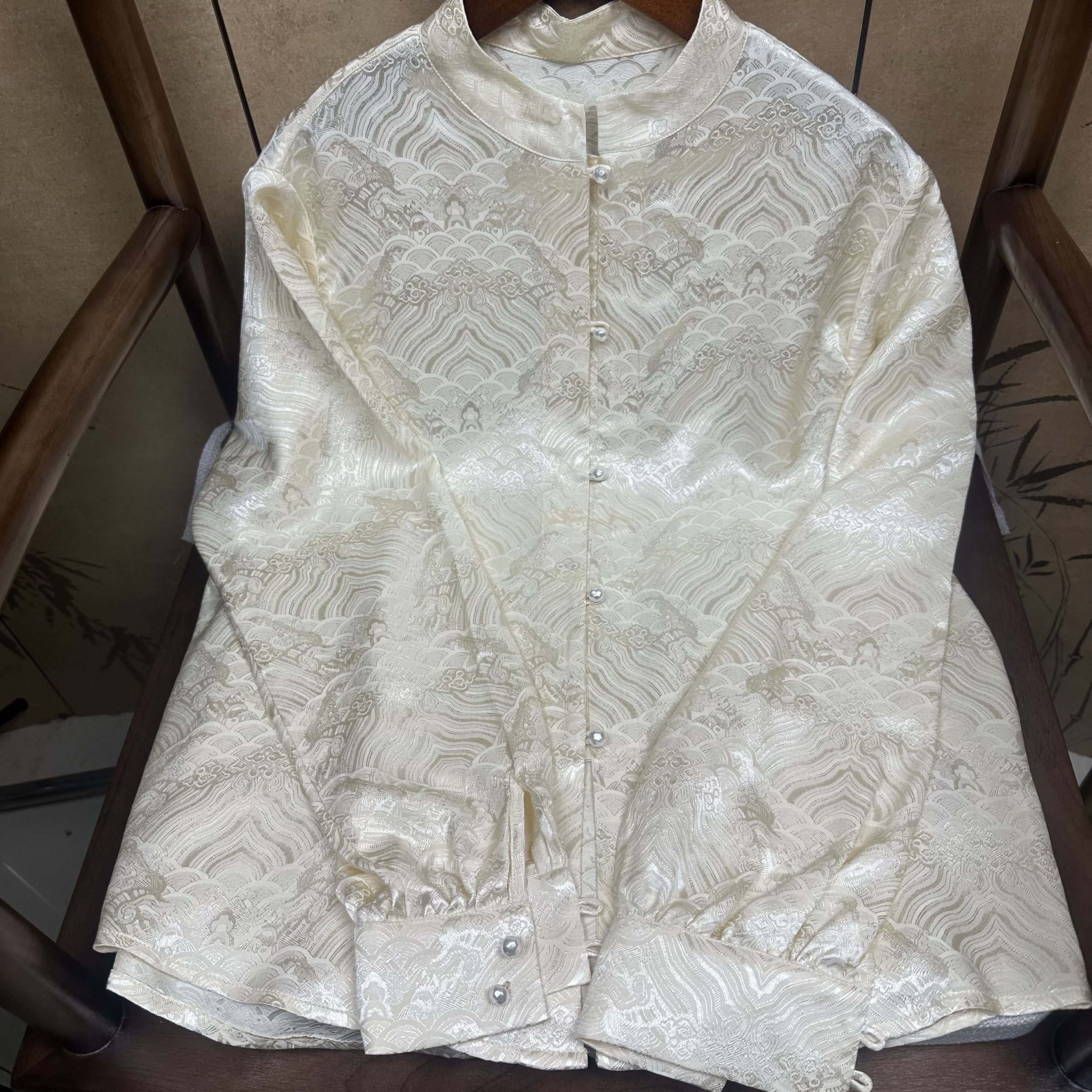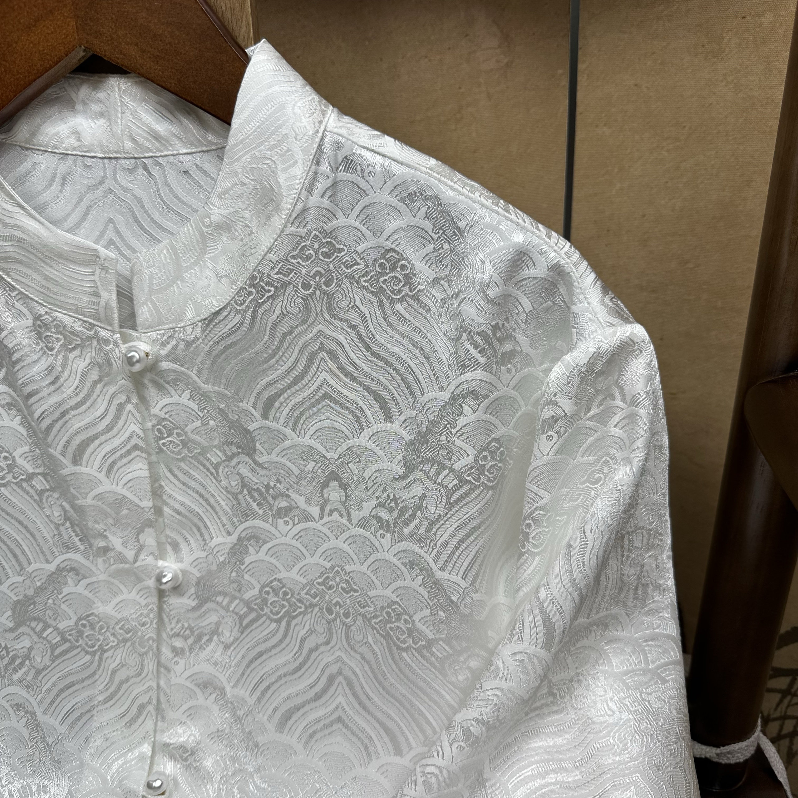 国风气质 新中式 100%桑蚕丝40姆米重缎海水江崖纹提花衬衫 对襟衬衫