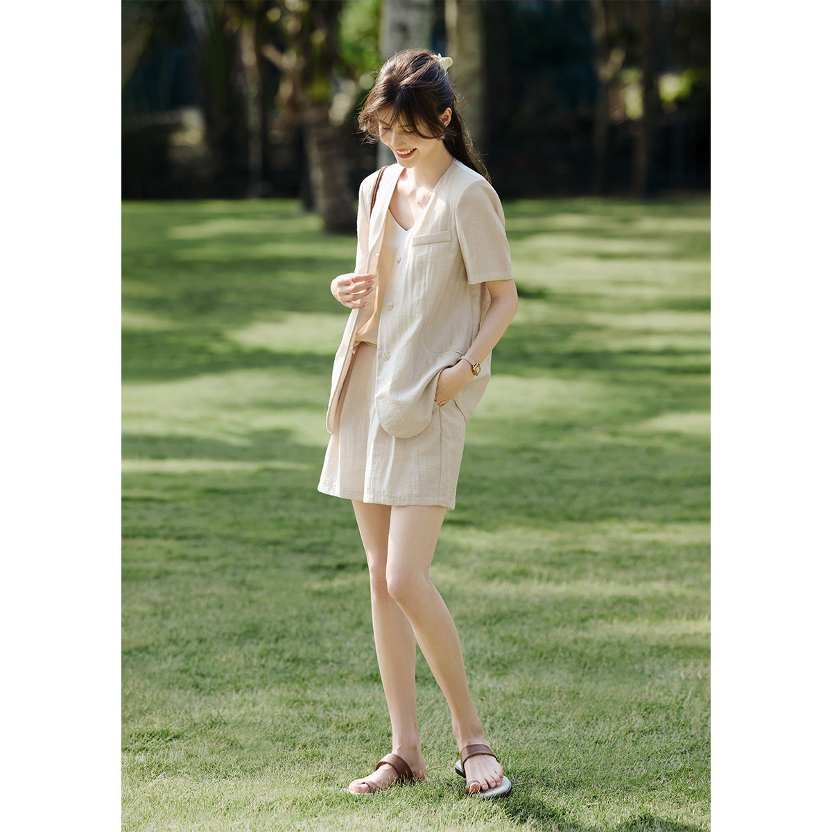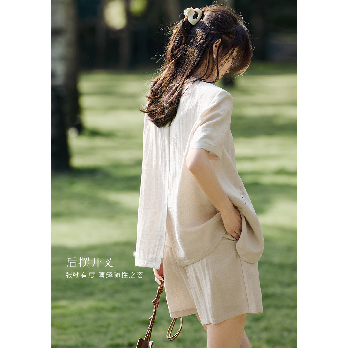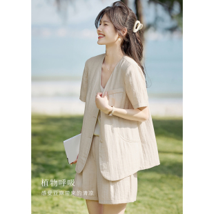 休闲松弛阔腿短裤 XWI欣未棉麻无领短袖 女夏季 外套套装 两件套 西装