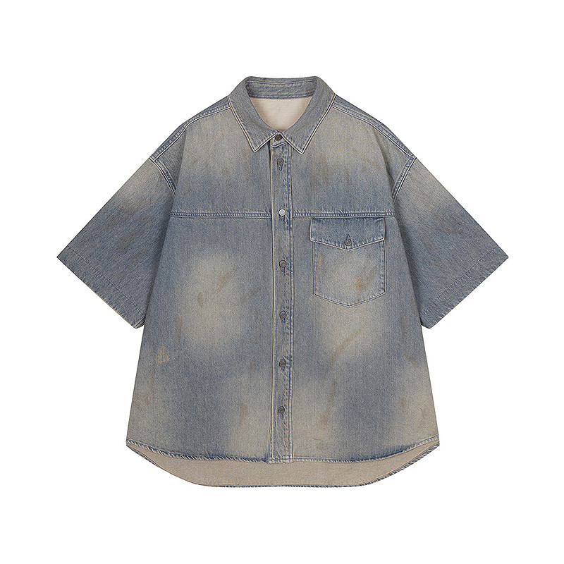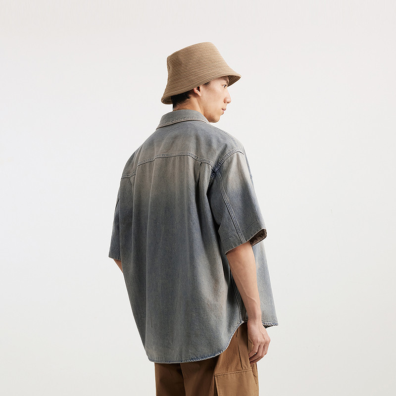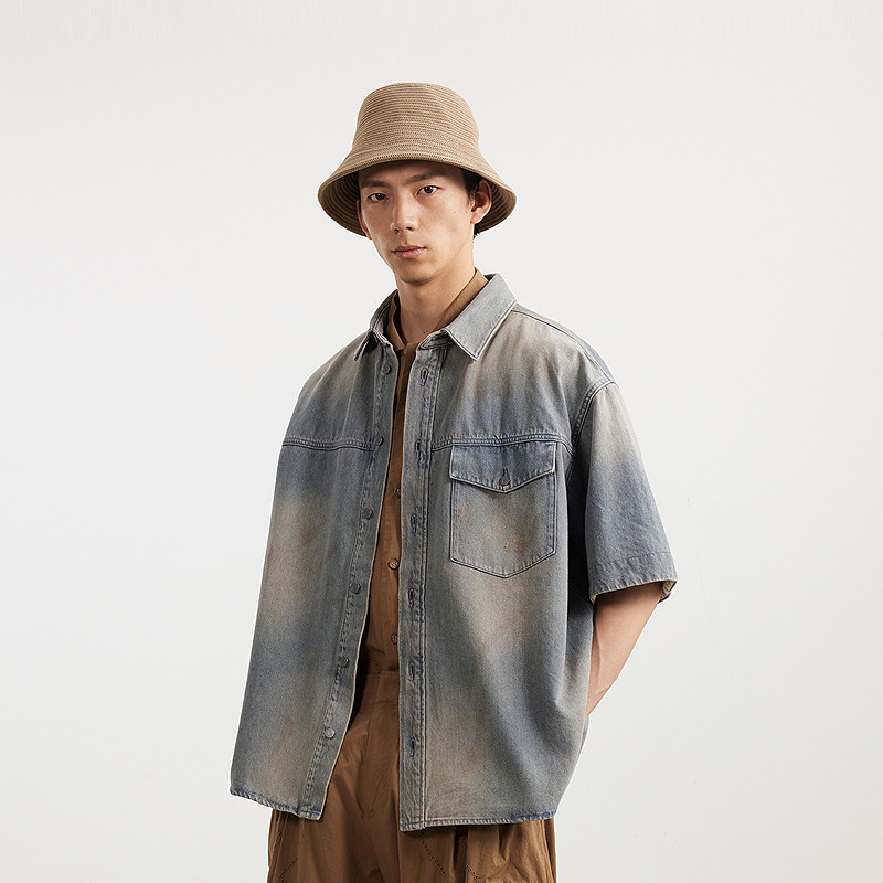 春夏新款 速写男装 男士 短袖 水洗牛仔棉麻复古时尚 衬衫 含汉麻